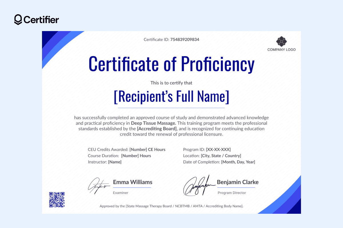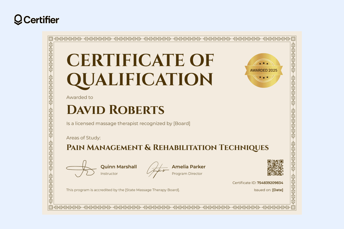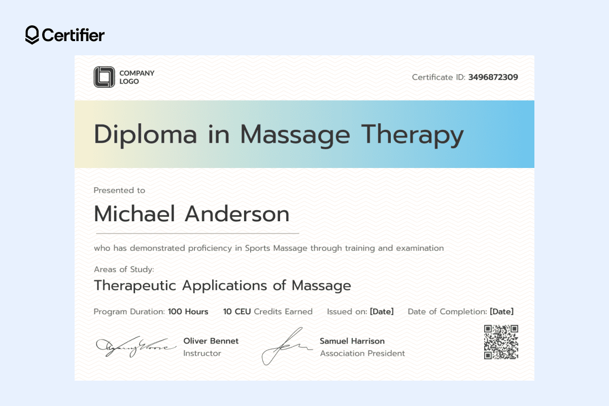 The sharp color contrast and structured spacing make it an excellent fit for advanced modules or specialty training such as sports massage. And with Certifier, you can add powerful verification features—like QR codes and unique IDs—with just one click.