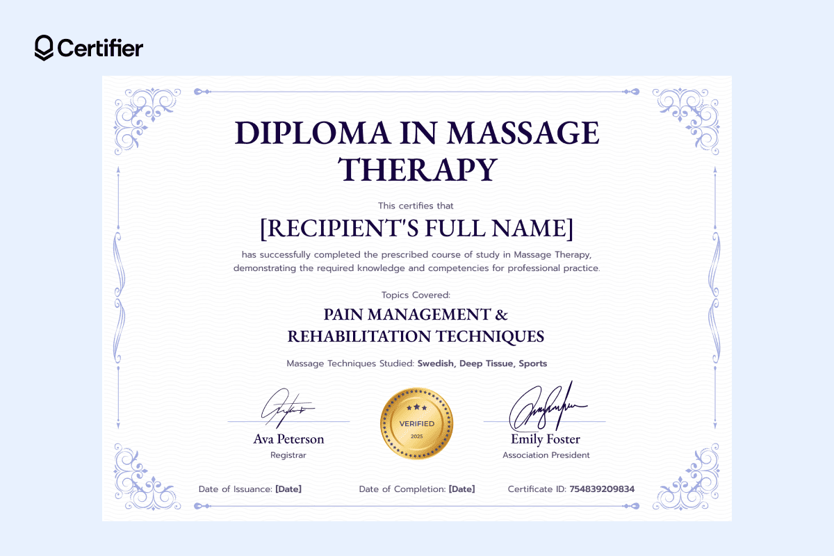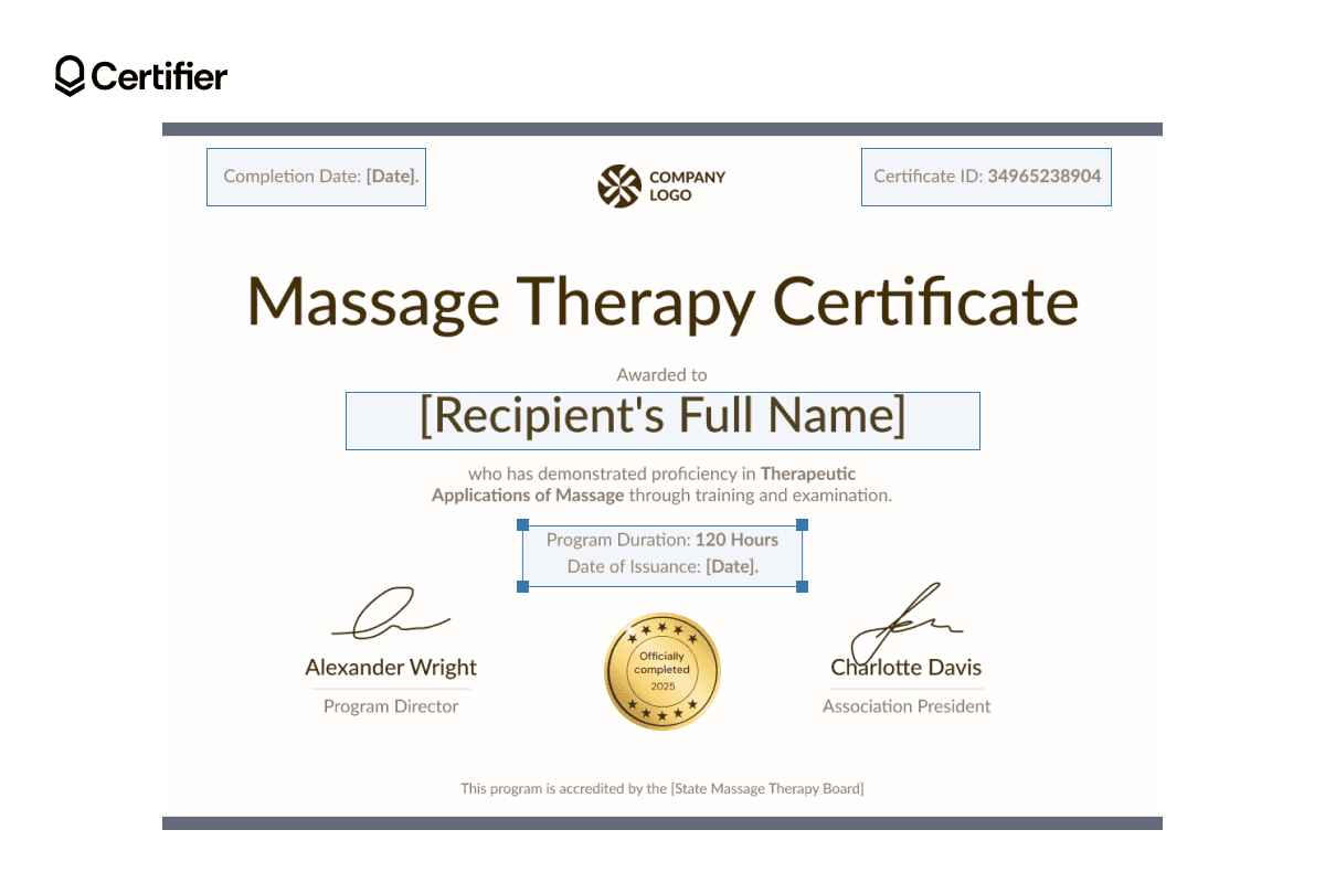 With these customization options and smart data fields, your chosen template becomes a fully branded, error-free massage therapist certificate ready for seamless issuing.