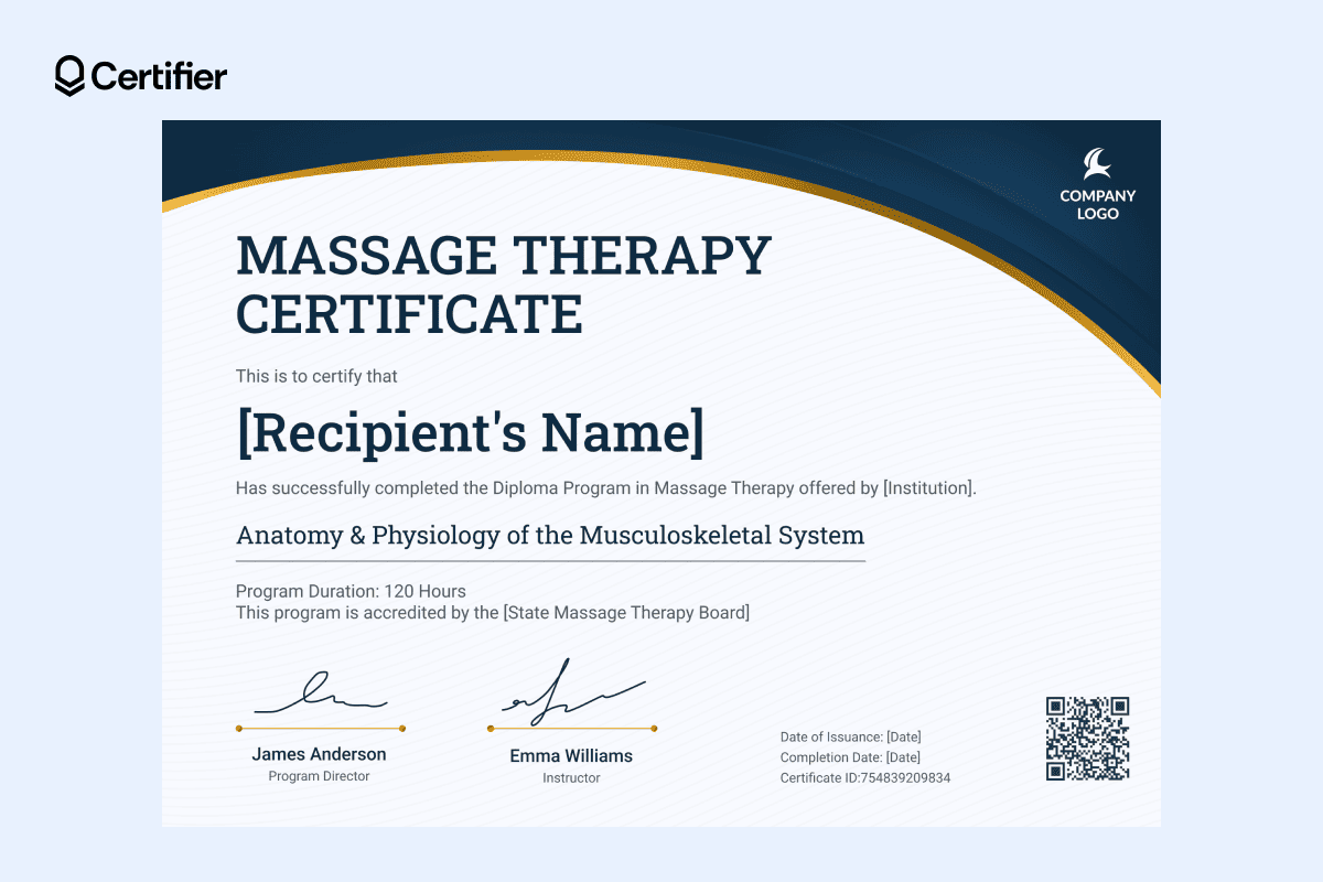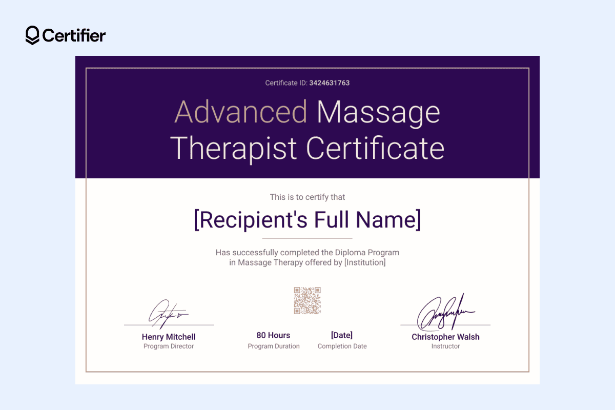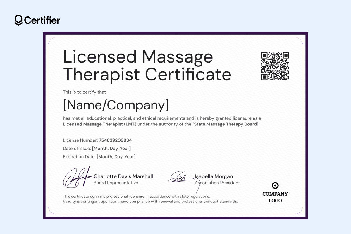 Start by selecting the massage therapist certificate template that best fits your program, training level or licensing needs. And if you don’t find the perfect match here, Certifier’s full certificate template gallery offers hundreds more options to explore.