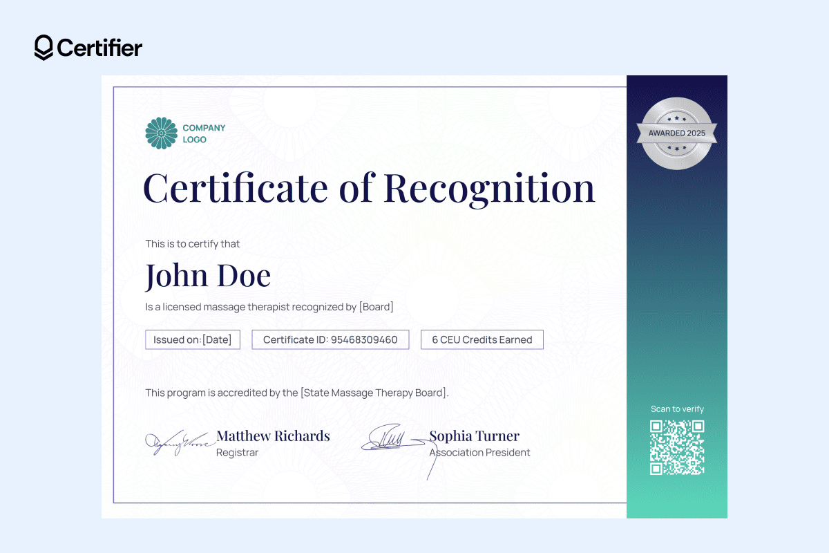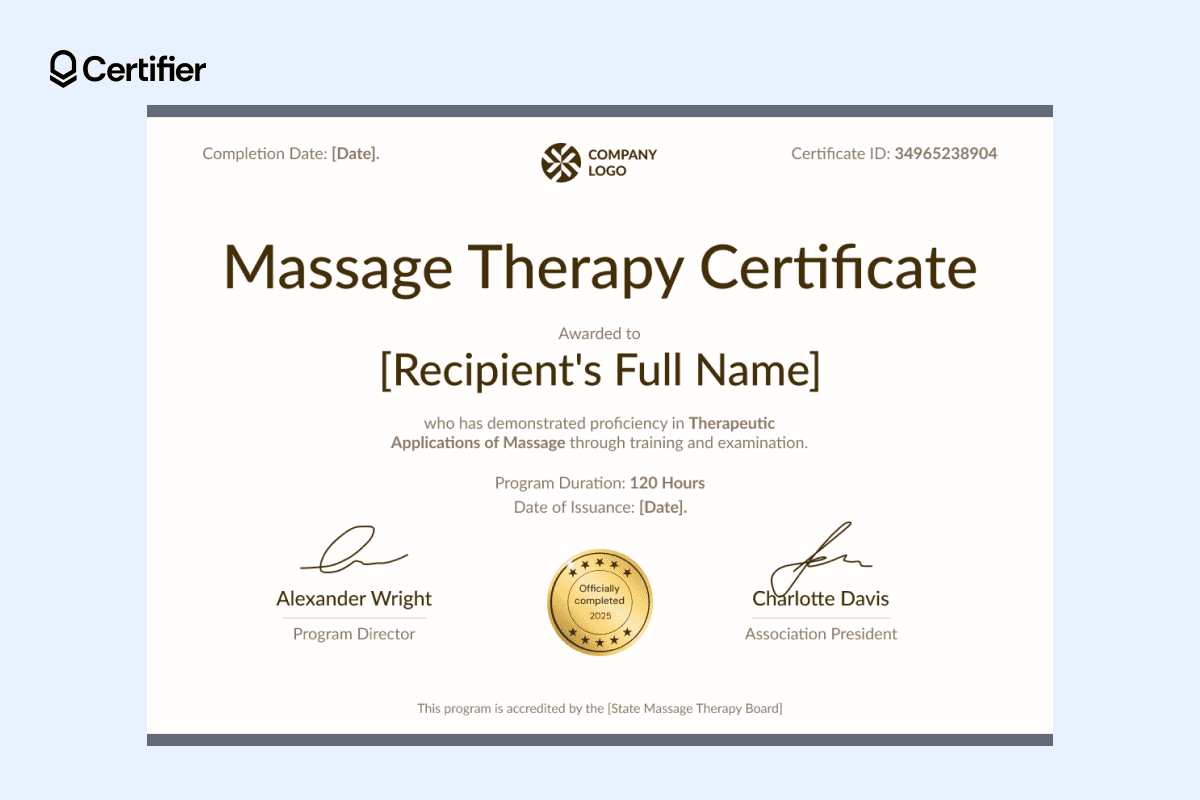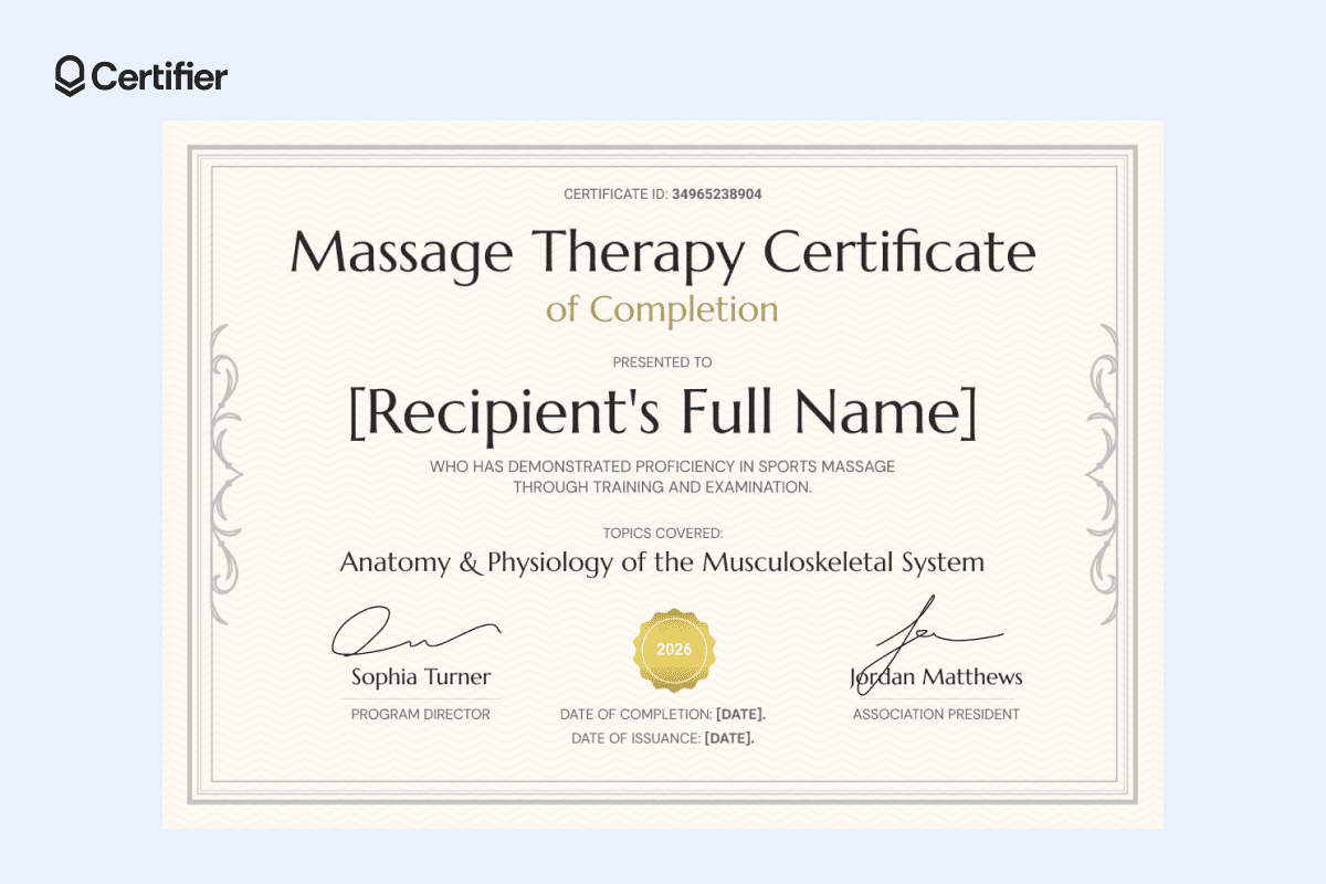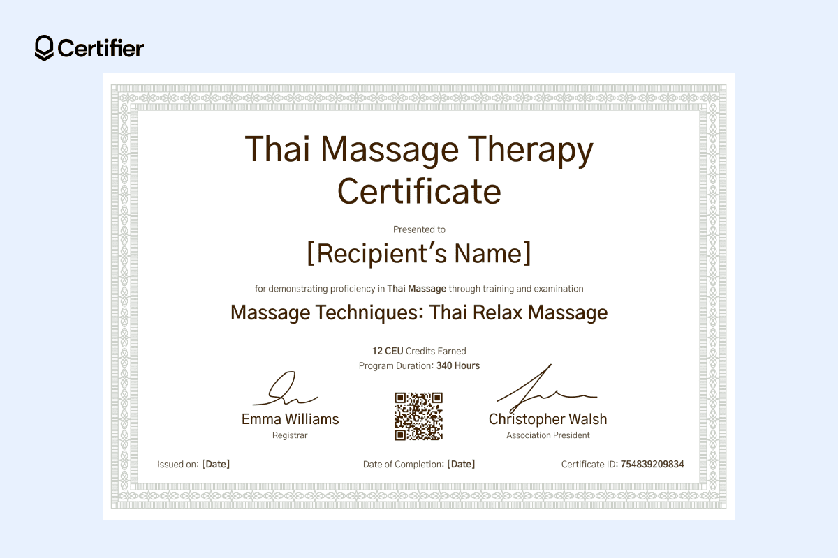Start by selecting the massage therapist certificate template that best fits your program, training level or licensing needs. And if you don’t find the perfect match here, Certifier’s full certificate template gallery offers hundreds more options to explore.