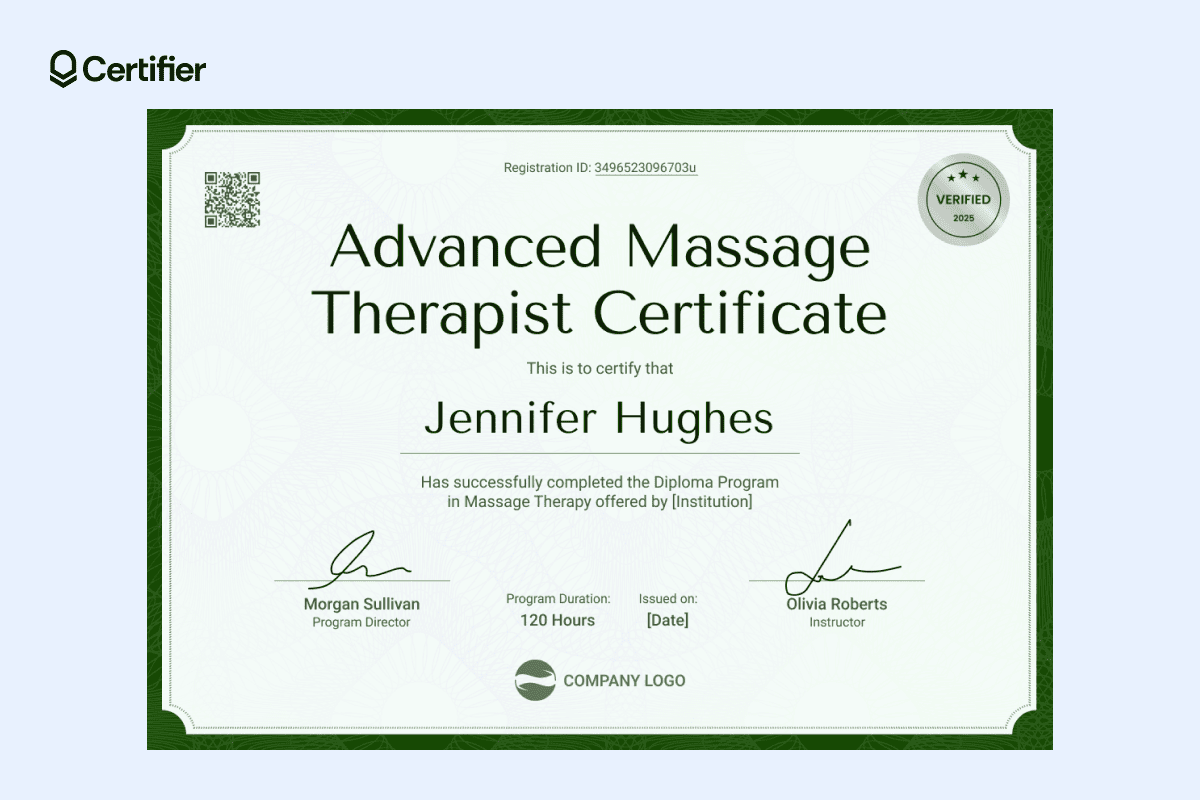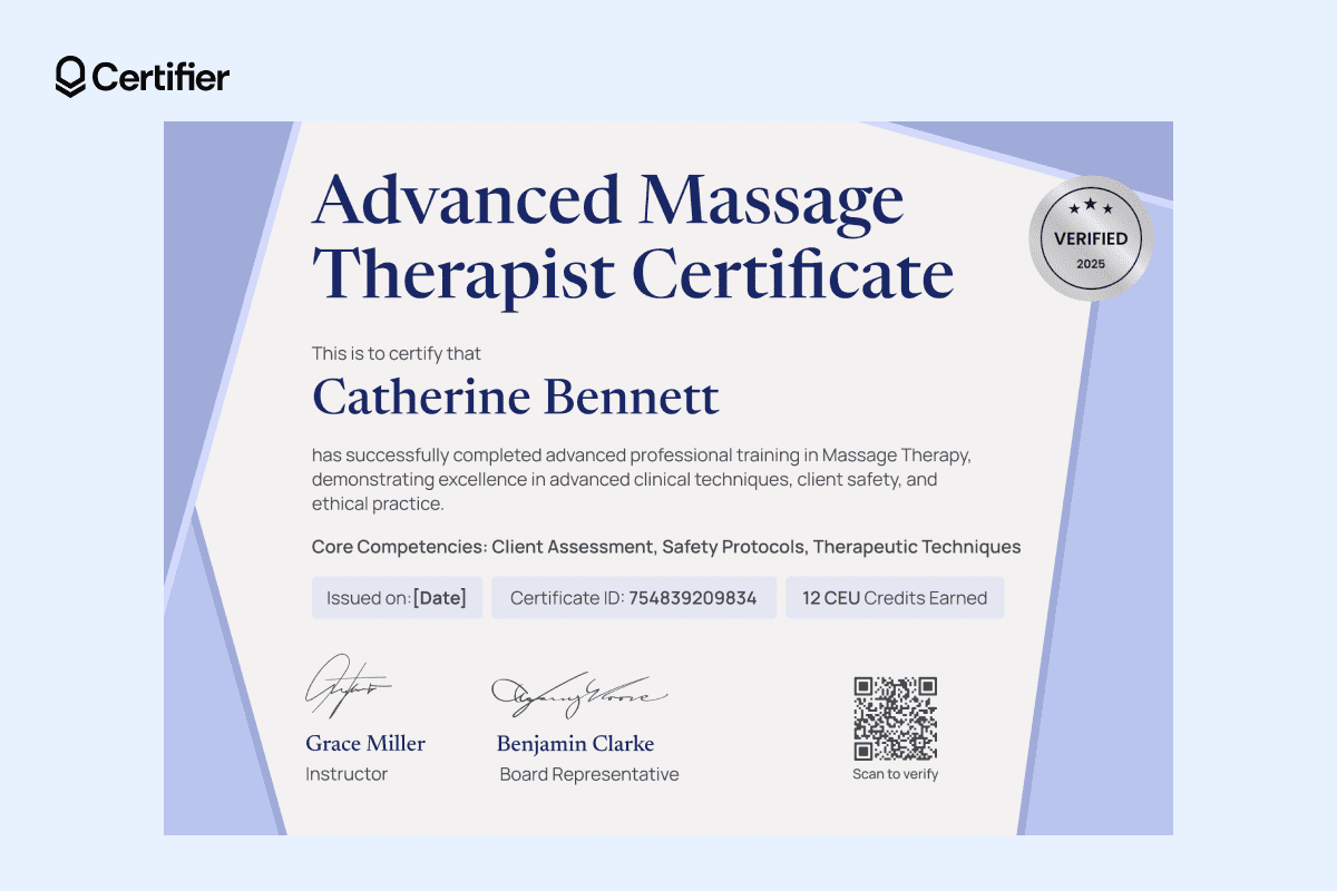 That’s why, at Certifier, we created this collection of 15 editable massage therapist certificate templates—professional, verifiable and ready to issue instantly.