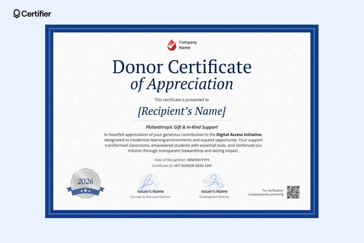 The next donor certificate of appreciation template features a bold blue ornamental border and a prominent year badge. The layout clearly highlights the donor’s name and contribution purpose, supported by a central organizational seal and a visible certificate validation QR code.
