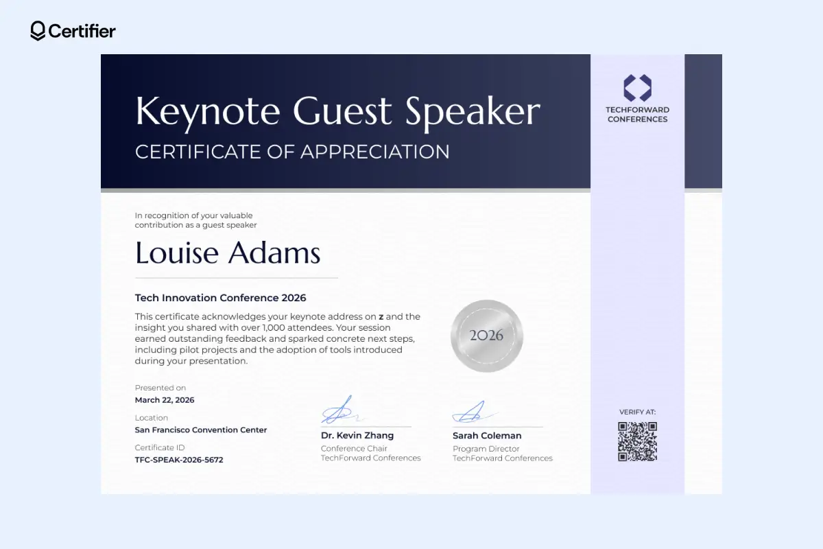 This keynote guest speaker certificate of appreciation template is ideal for conference organizers who need a professional way to acknowledge a main-stage presentation.