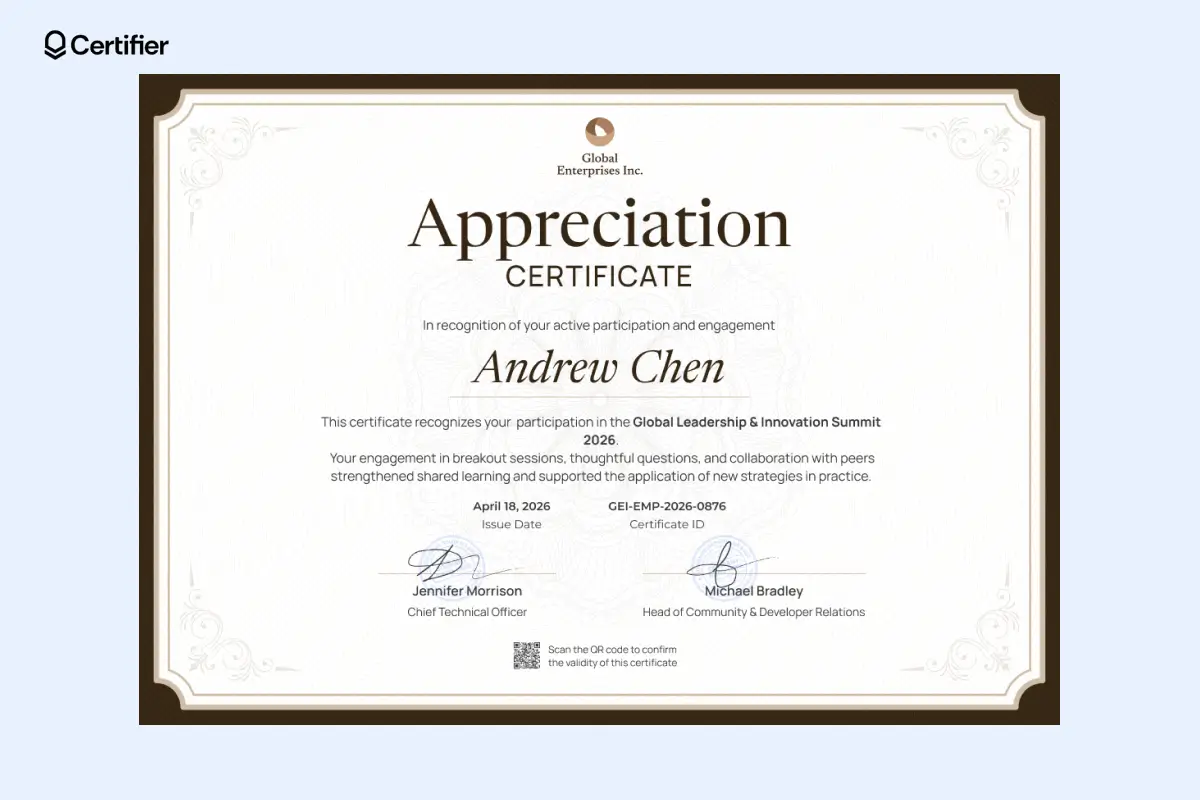 Designed simply yet uniquely, this creative appreciation certificate provides all the information you may need to include on a certificate (including the space for the award's comprehensive details and a QR code). If you feel that any of these elements are redundant, you can easily edit them in the Certifier editor.