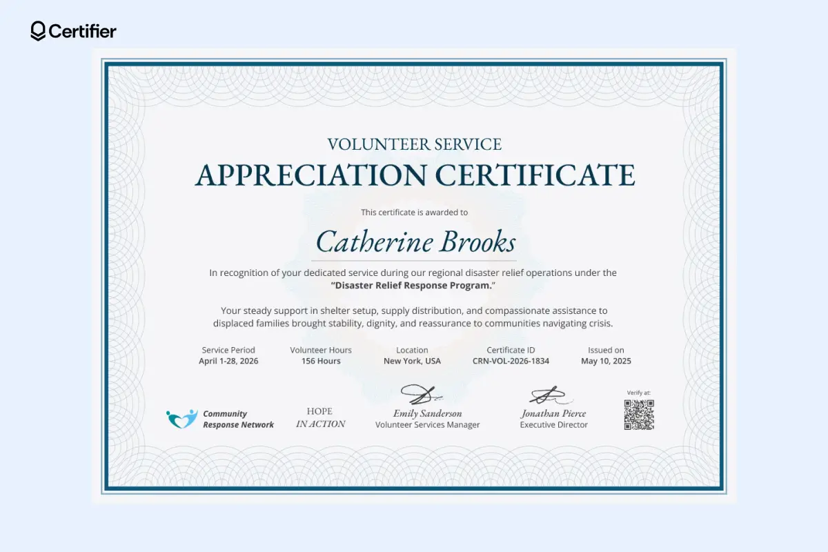 It’s an excellent choice if you’re up to issuing professional volunteer certificates of appreciation that are quick and easy to generate in bulk. You can also send digital certificates via email–all at once.