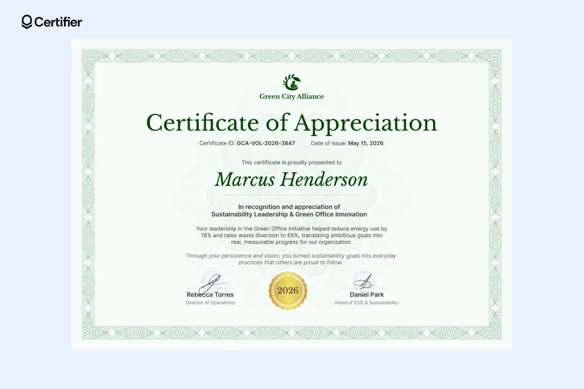 If you don't want to go crazy with the colors, stick to the professional dark green. This certificate of appreciation can really boost achievement value. And its golden badge at the center helps you highlight anything you want. Just customize it further with Certifier!