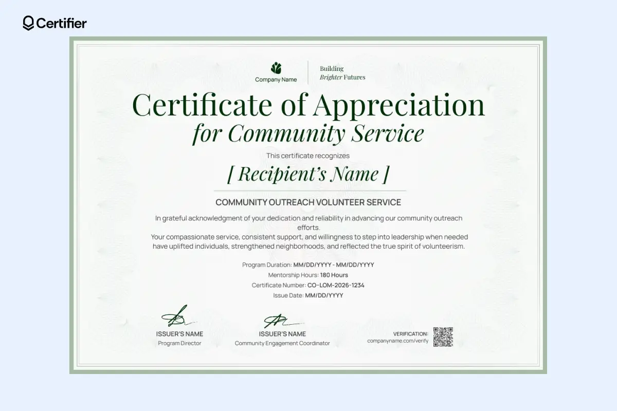 #3 Community service certificate of appreciation template for volunteer outreach programs