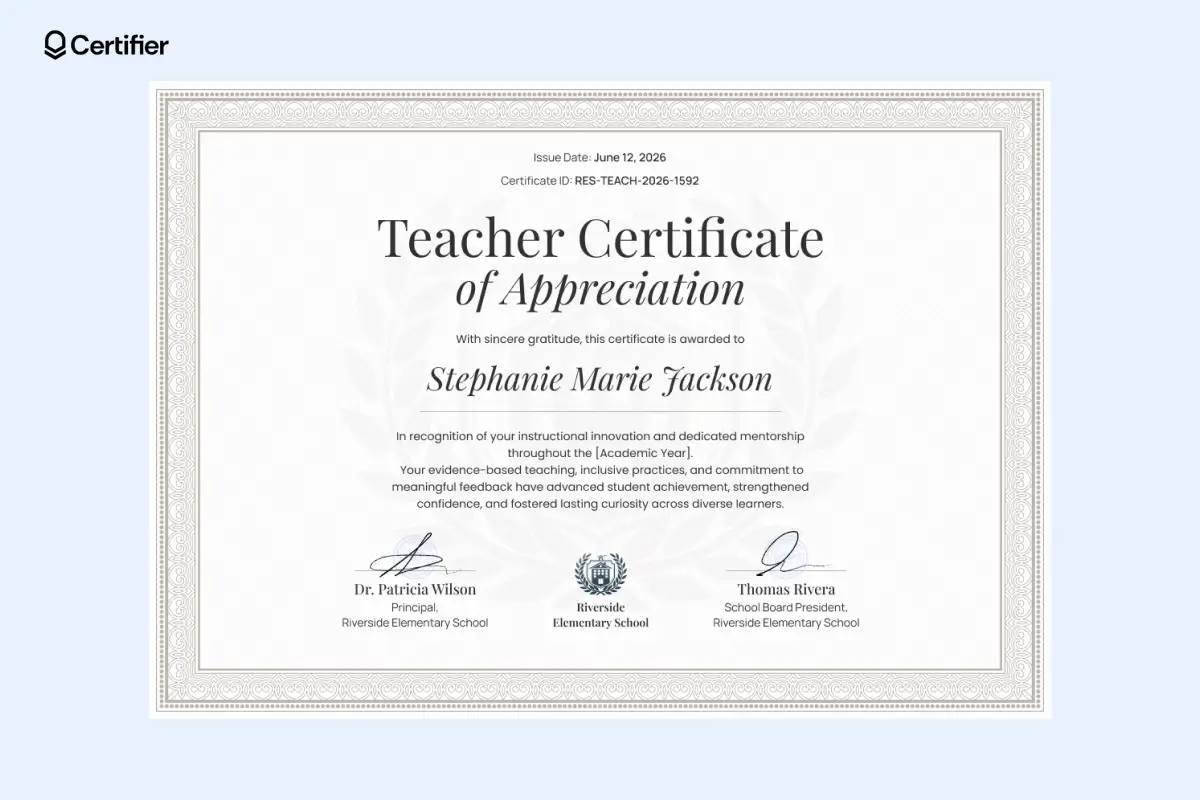 This certificate of appreciation for teachers wording is easily editable in Certifier’s template editor. Add the teacher’s name, a short thank-you message, your school name, and the principal’s signature.