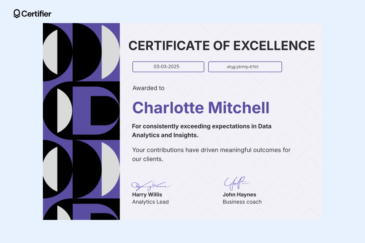 Creating a certificate of excellence may be super simple. Certifier’s drag-and-drop editor makes designing certificates fast and easy.