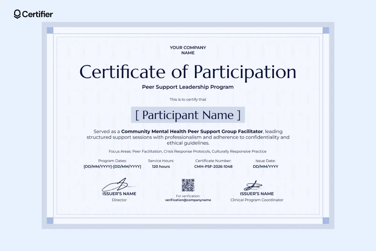 The template is highly adaptable for different needs. Open it in Certifier’s editor to adjust wording and update branding elements. Feel free to use it for peer support leadership programs, community mental health initiatives and structured service-based training.