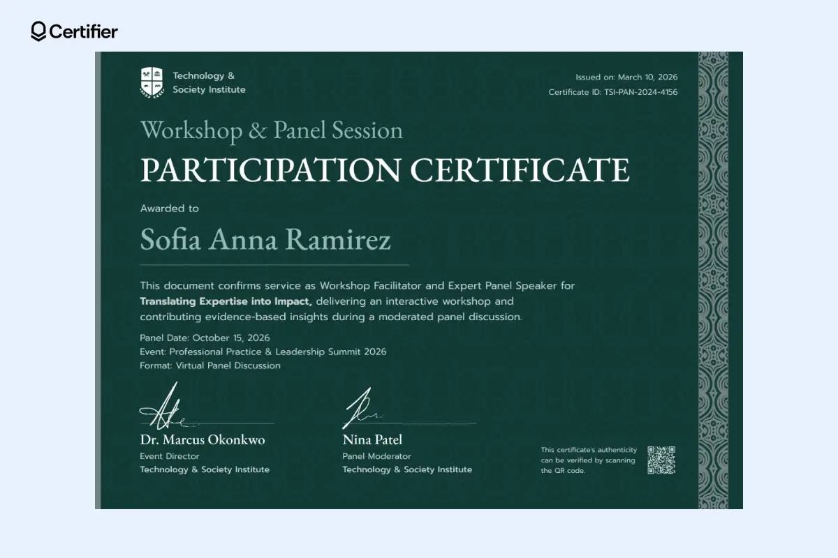 The QR code at the center provides an extra layer of security, so you can verify the certificate's authenticity. It's great for design workshops, art exhibitions, or any creative event where participants enjoy good design.