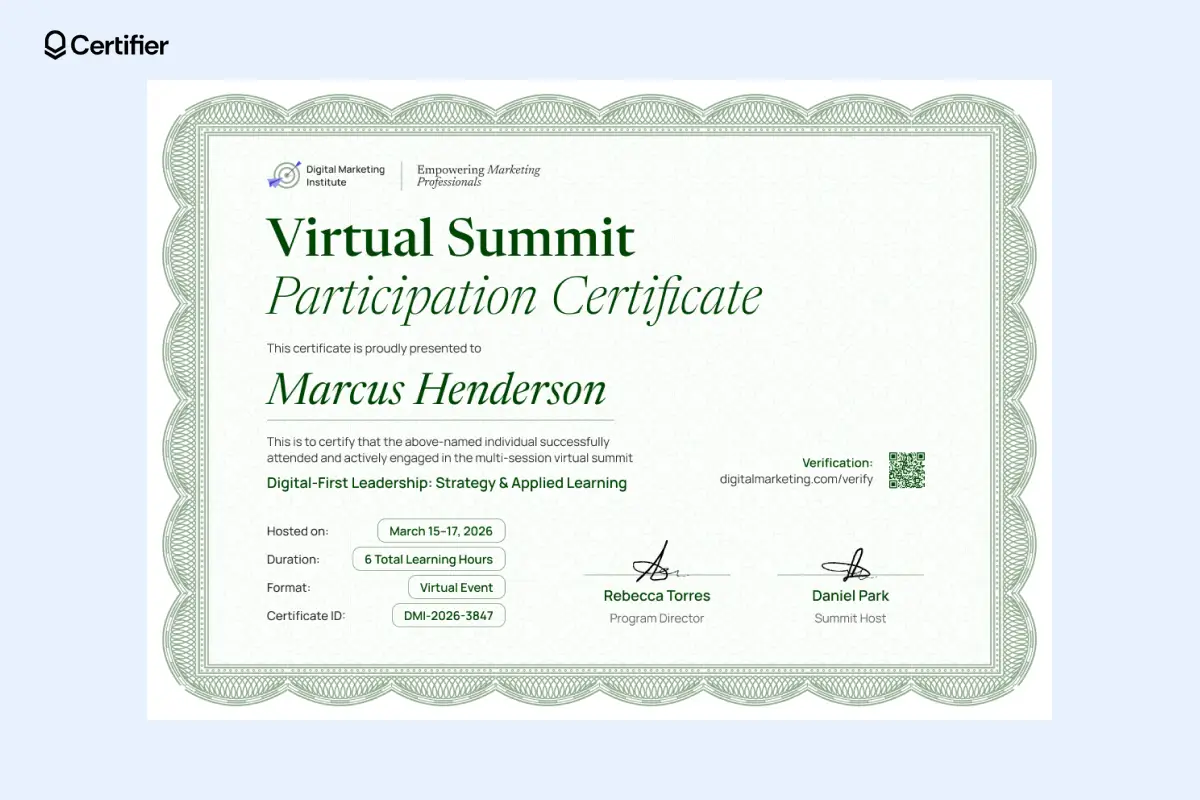 The above virtual summit certificate of participation features a light green scalloped border and aligned to the left text designed for digital-first events.