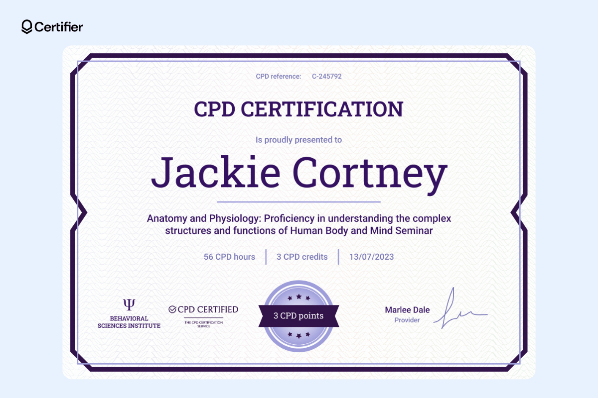 You don’t have to look further. As a CPD certificate template should be, these designs are minimalistic and professional. They all contain all the essential elements, along with the CPD points badge. There is something for everyone (and Certifier keeps updating it!).