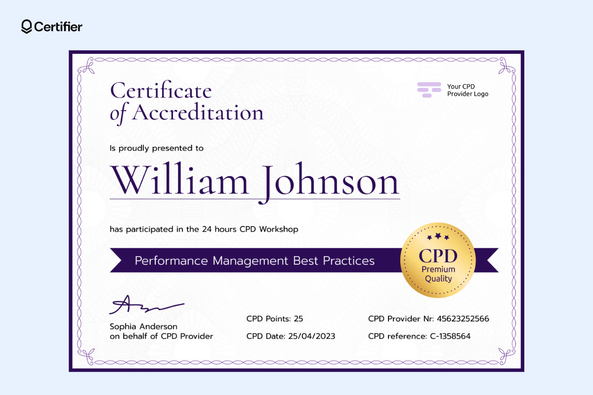 Continuous Professional Development (CPD) certificates prove professionals' commitment to learning and growing. Although there are so many graphic design tools, creating a CPD certificate template from scratch still takes time.