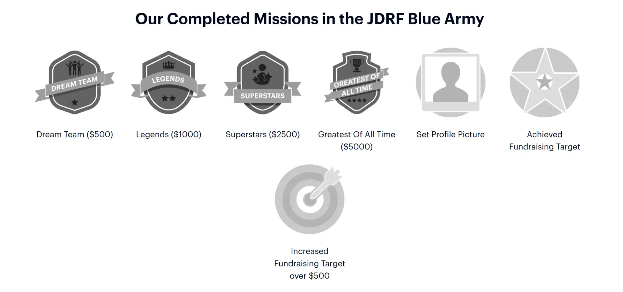 Example: The “Virtual 25” challenge by JDRF awards digital badges for events as participants complete walking and fundraising milestones–5 km, 10 km, and beyond.