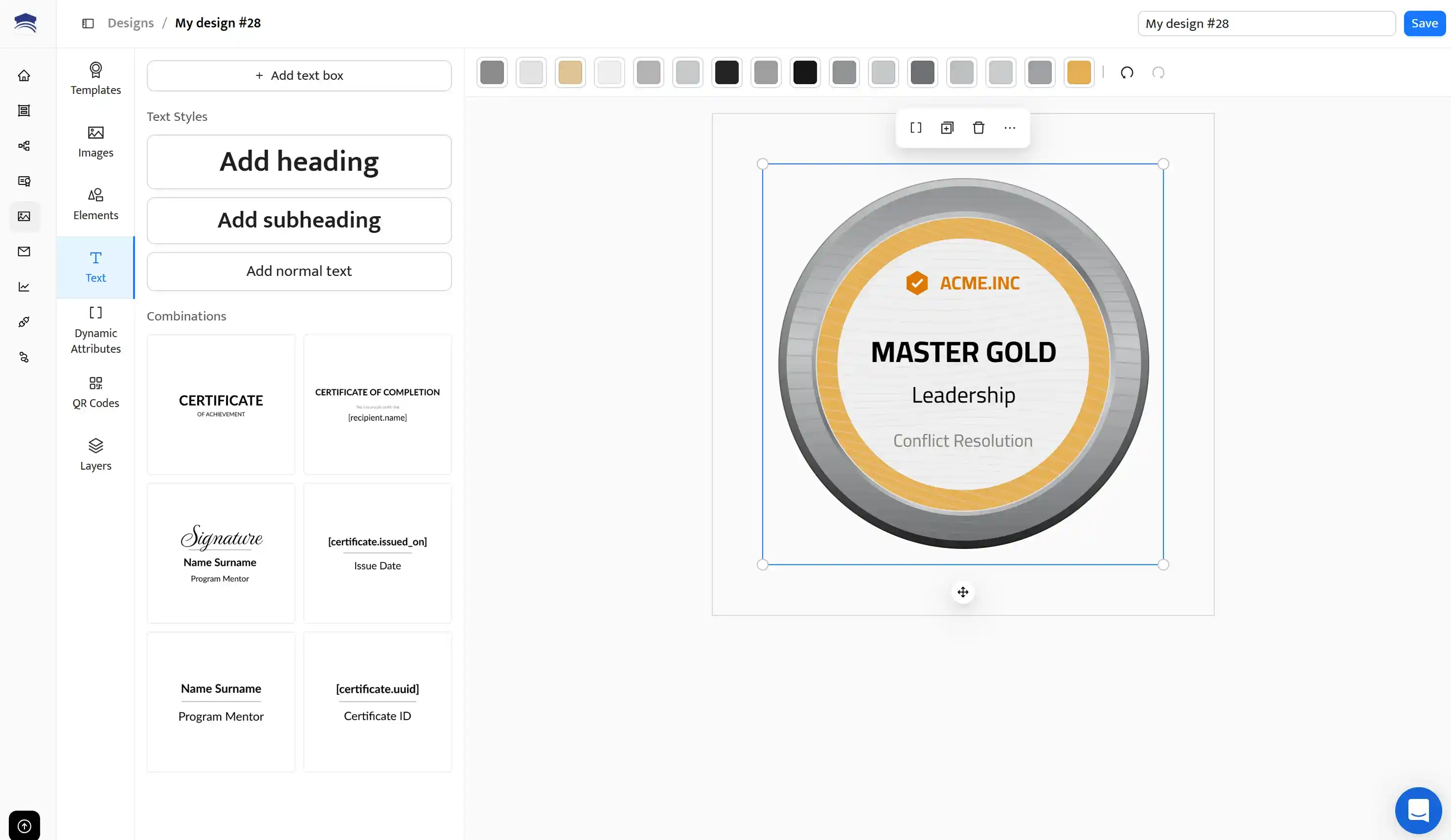 Use ready-made templates or create custom event badges from scratch. Add your logo, event name and badge type (attendee, speaker, sponsor, etc.). With dynamic attributes, can personalize badges for hundreds of recipients using one template.