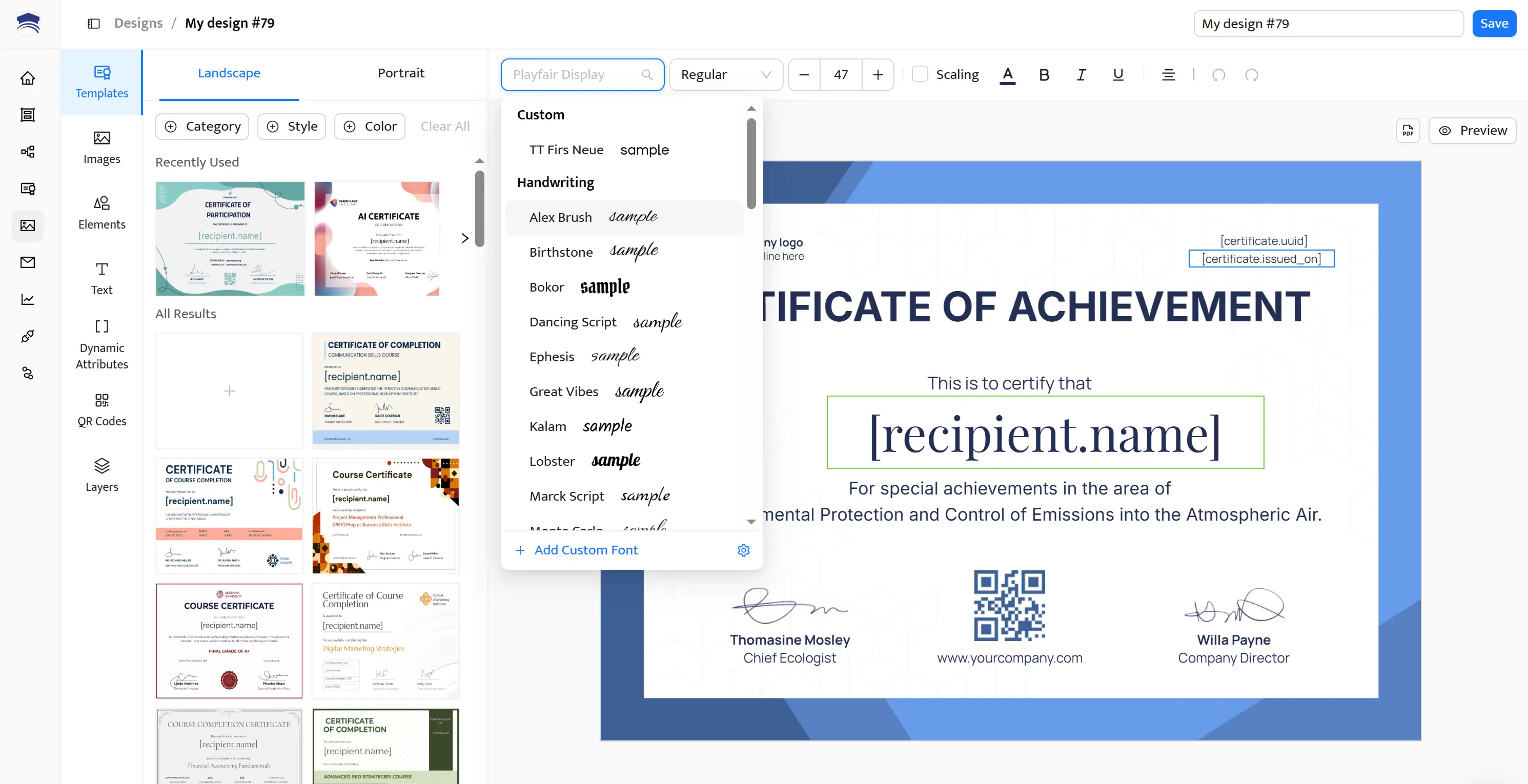 In Certifier, you can apply a font for signature directly in the editor and see how it looks on your certificate right away. Once you find the best signature font, you can reuse it for every certificate, no manual signing. And the best part: they're all free to use.
