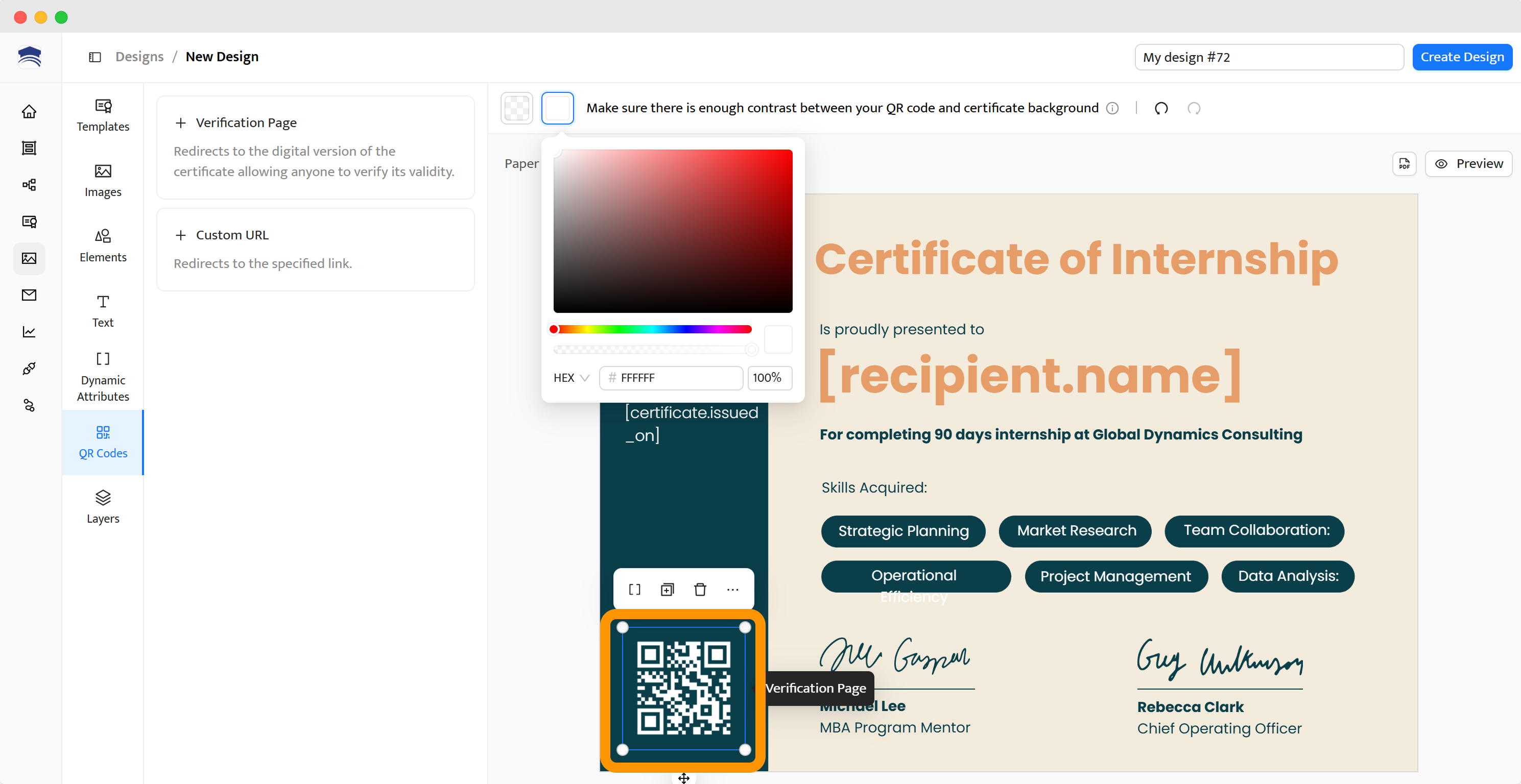 Your certificate should include a visible and scannable QR code (for printed and digital versions). Use the QR code generator found in the left-hand panel. Here are your two options: