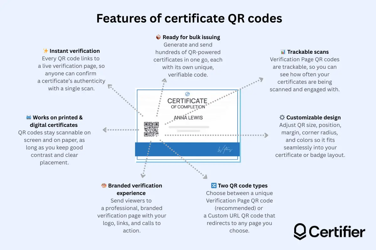 See the power of QR code verification for certificates and their benefit to your business. Get to know how to create a certificate with a QR code in 2026 with Certifier in a few minutes (literally!) that is unique, secure, and automated.