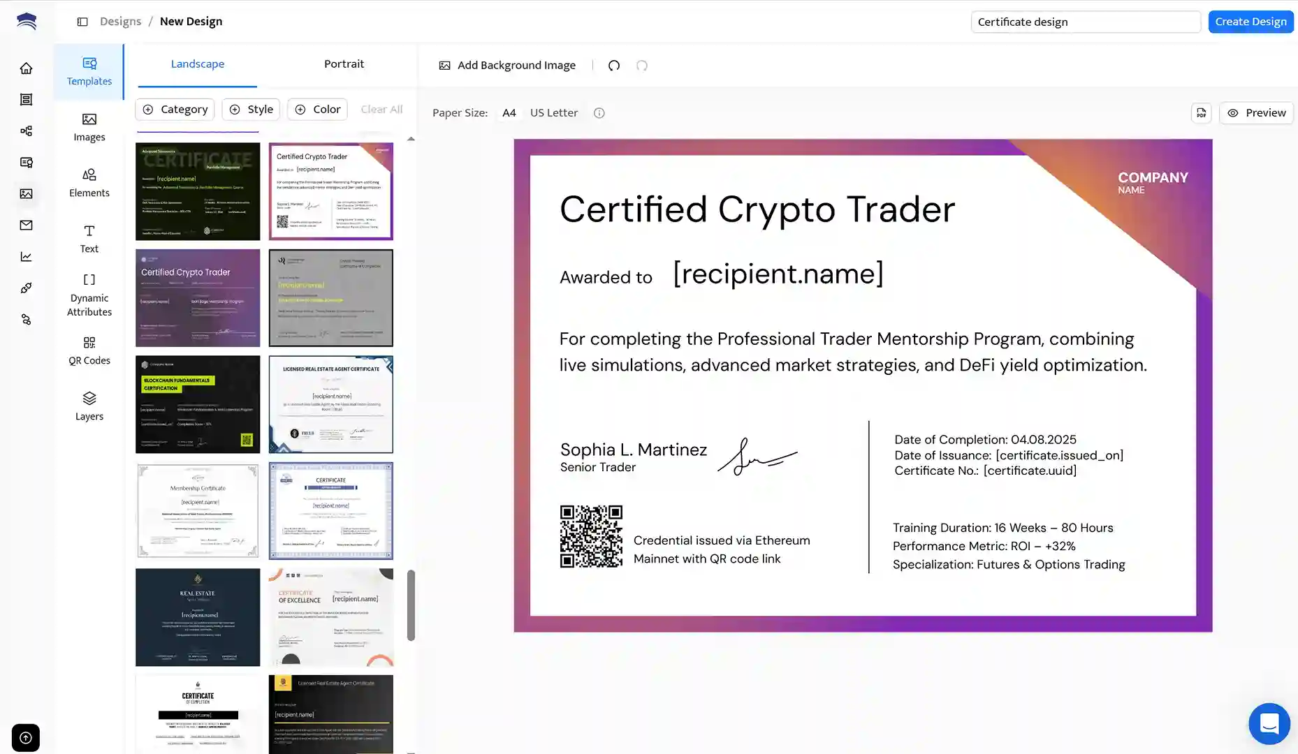 Certifier includes thousands of ready-to-go templates. You can use, customize, and edit them for free. Also, you can create a new design from scratch in our e-certificate generator from Excel. You can upload certificate backgrounds, frames, and elements. Make sure to customize your certificate design to match your brand identity. Choose the elements for your design: upload the logo, signatures, etc.