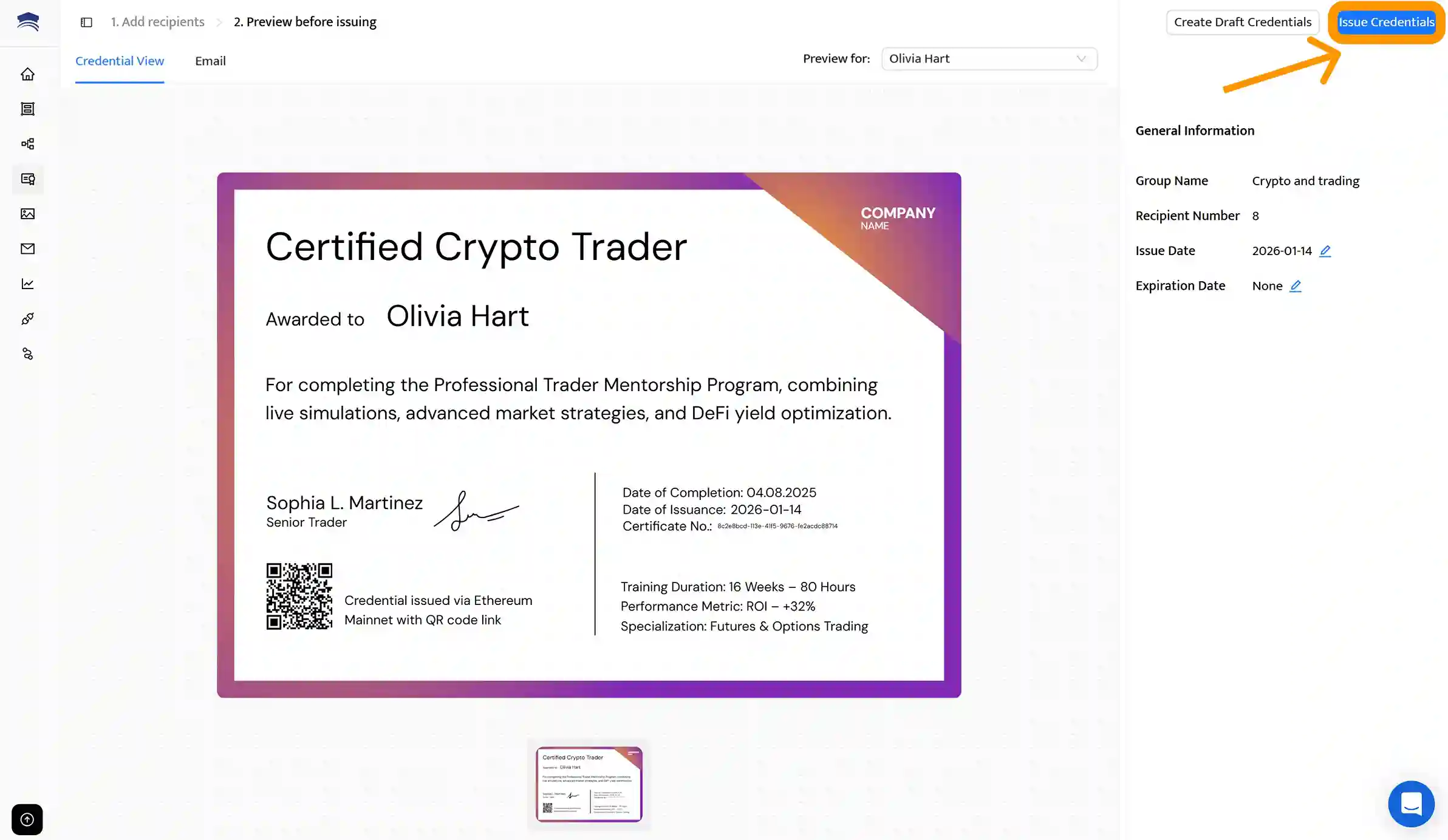 Remember to use professional tools like Certifier for convenient certificate generation from Excel. Certifier – free bulk certificate generator Excel or Google Sheets, includes such features as LinkedIn certificates, socia media shares, verifiable credentials, and professional designs.