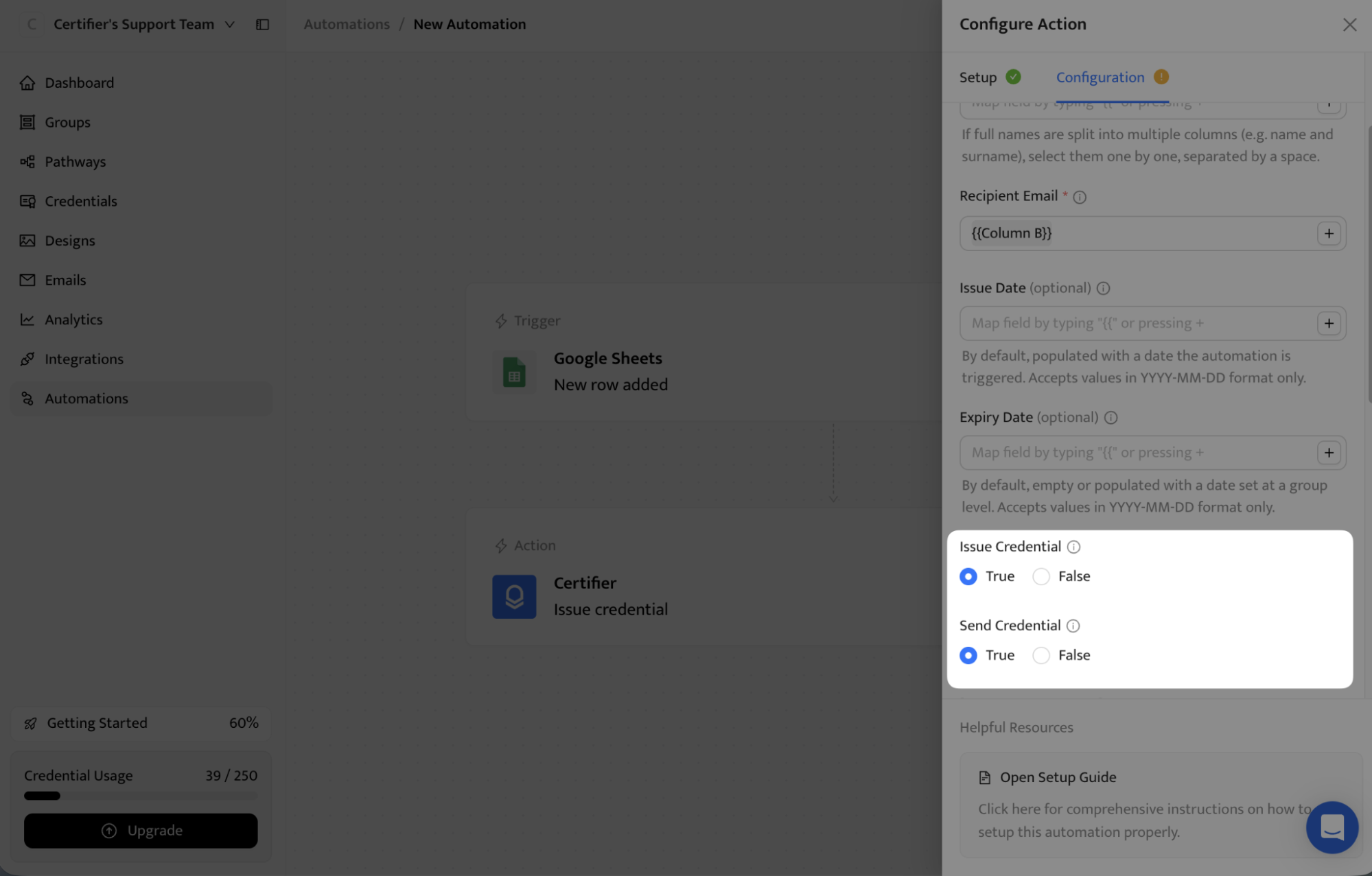 Step 2: Create a Google Sheets or Excel automation in Certifier