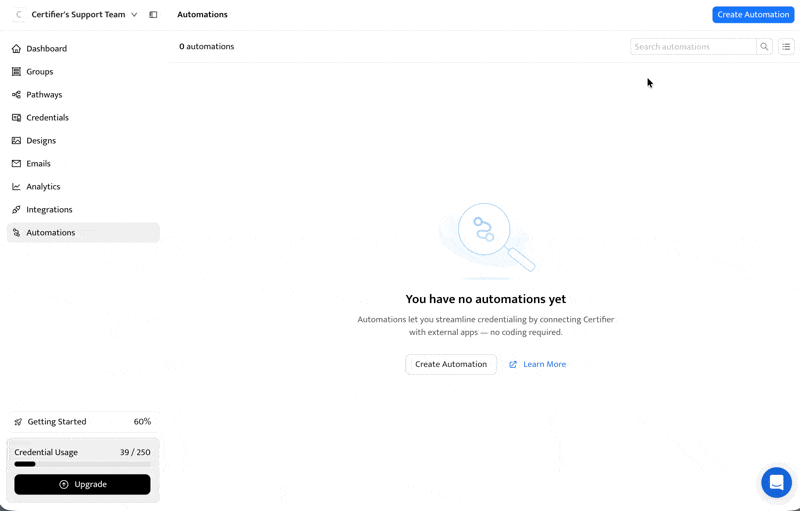 Zapier is the right choice when certificate generation is part of a larger automation. Use it when data needs to pass through multiple tools, when Certifier should act as a trigger instead of an action or when your setup goes beyond spreadsheets alone. This method suits complex, multi-step processes across CRMs, LMS platforms and internal systems.