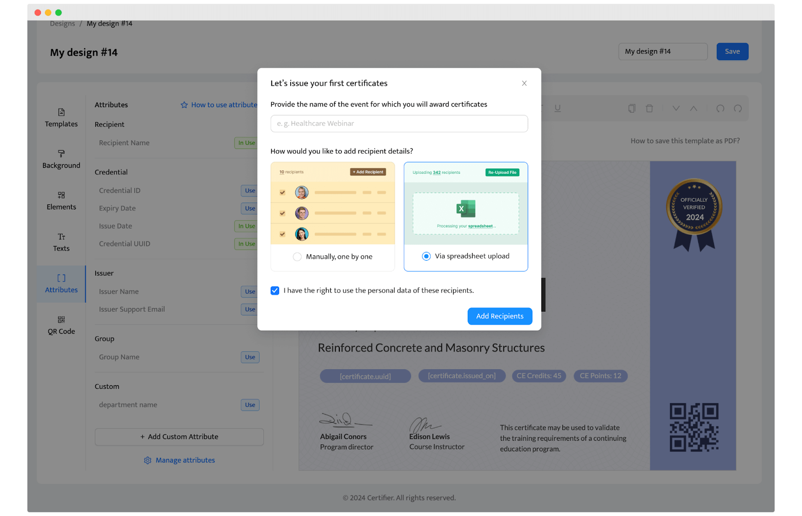 Semi-automatic via CSV upload for bulk issuance: Export your attendee list from Zoom, upload it to Certifier, map fields once, then issue certificates in bulk. It’s a great fit for one-off webinars or occasional events where you want to review the list before sending.