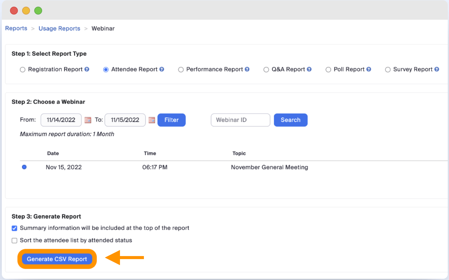 After your webinar ends, go to Zoom → Reports → Usage Reports and generate a CSV report for the session. Download the file to your computer.