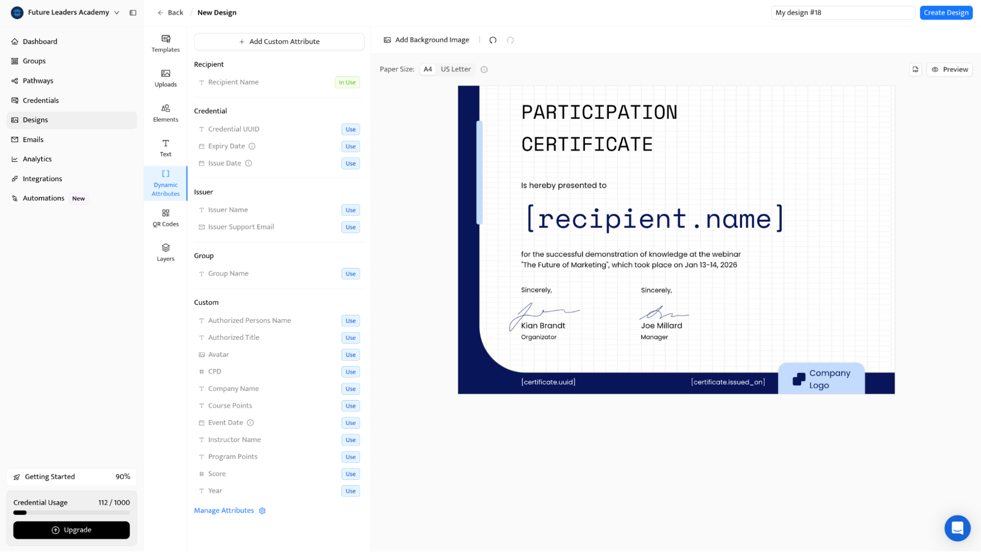 Variety of designs: Certifier offers a wide selection of webinar certificate templates. Customize them to match your branding and strengthen your professional image.