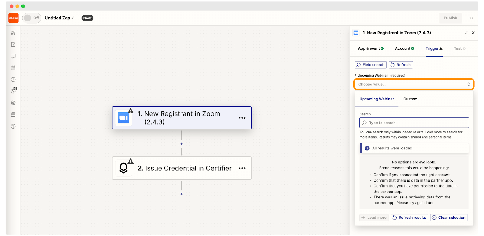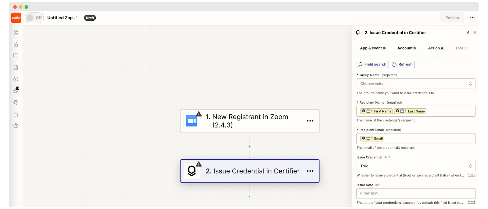 In Zapier, choose Zoom as your trigger (for example, new webinar registrant), then add Certifier → Issue Credential as the action.