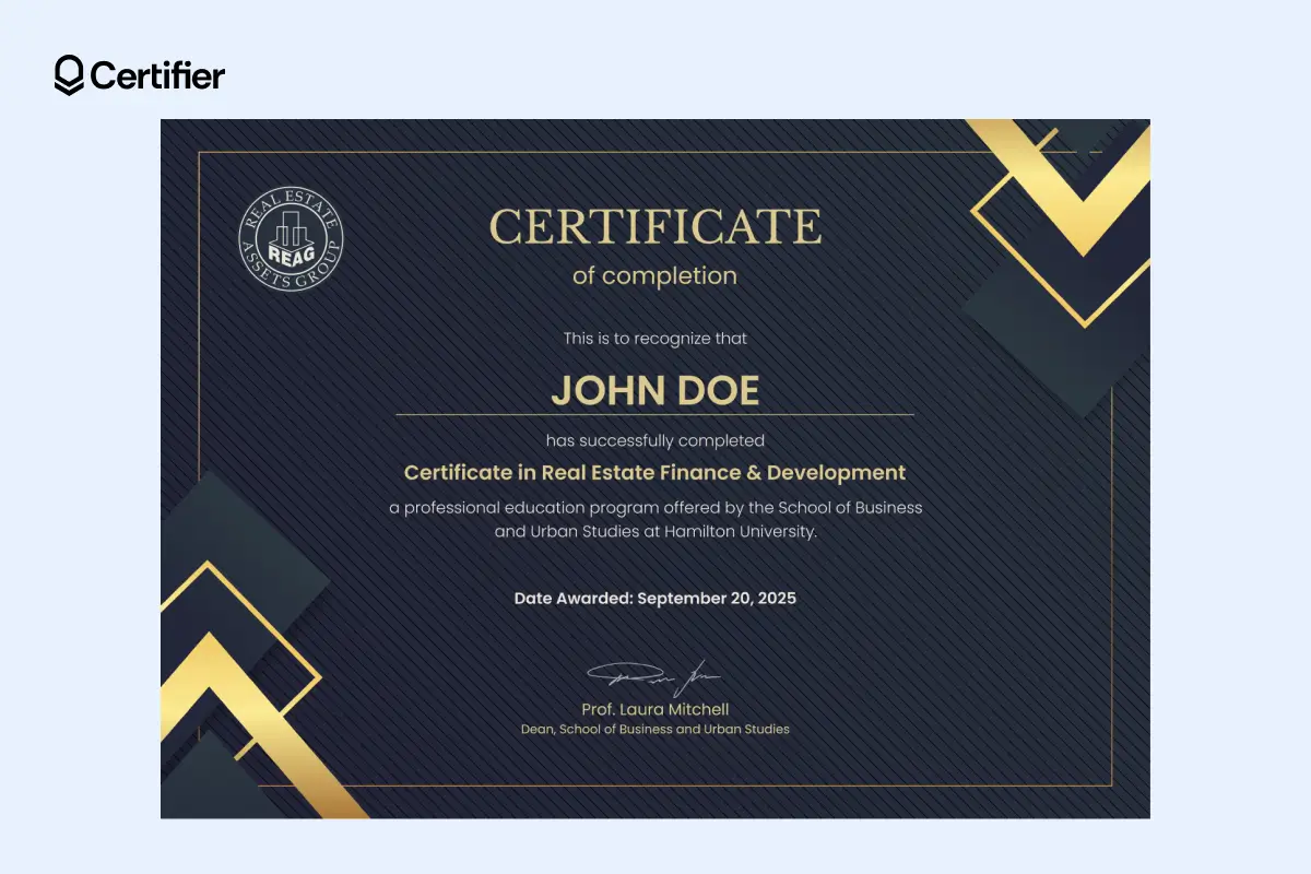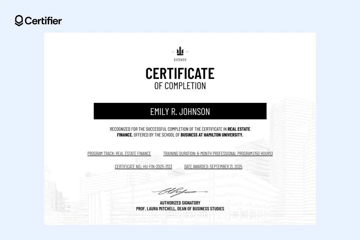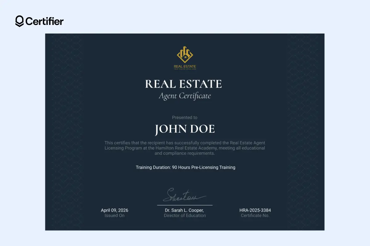 Explore ready-to-use real estate certificate templates for training, licensing or ownership. Choose a template, customize it to your context and issue credentials in minutes with Certifier.