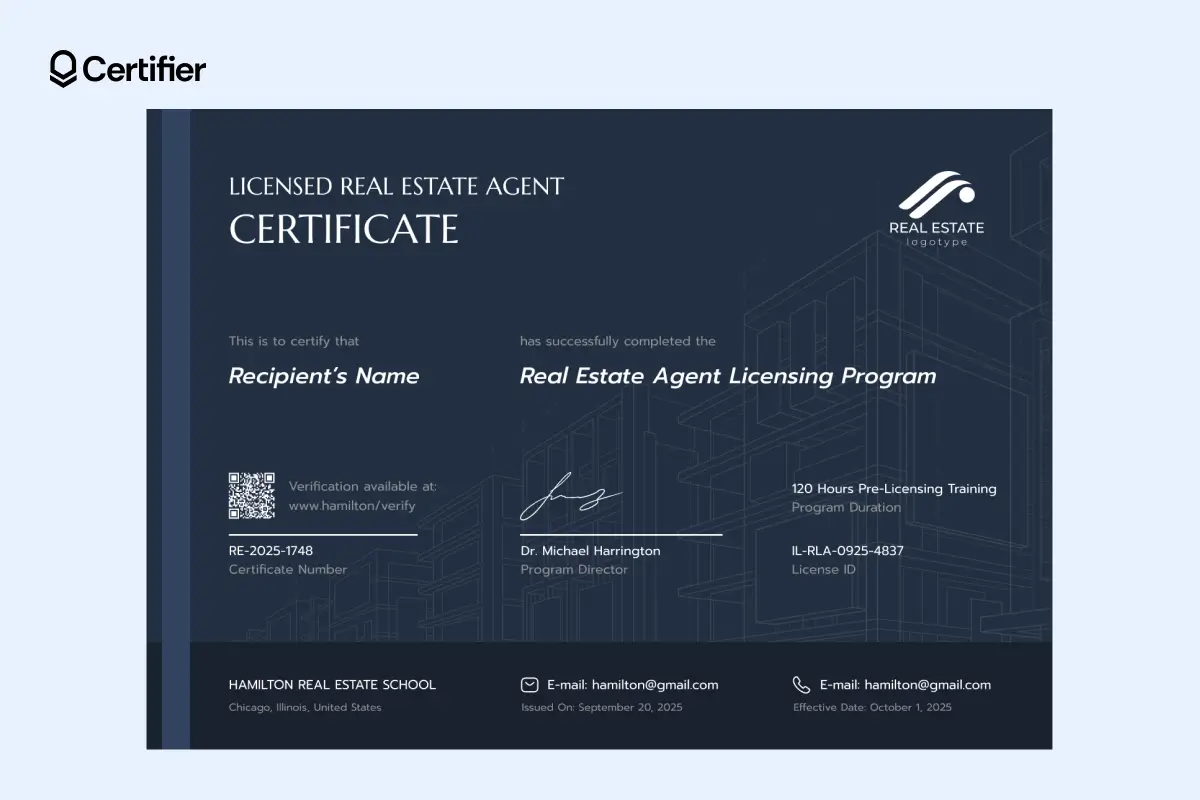 Suitable for real estate schools issuing official pre-licensing or regulatory training certificates.