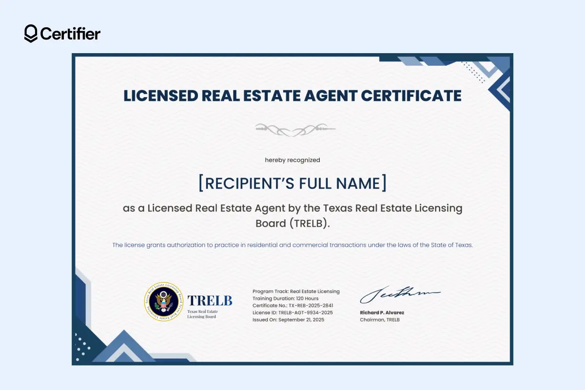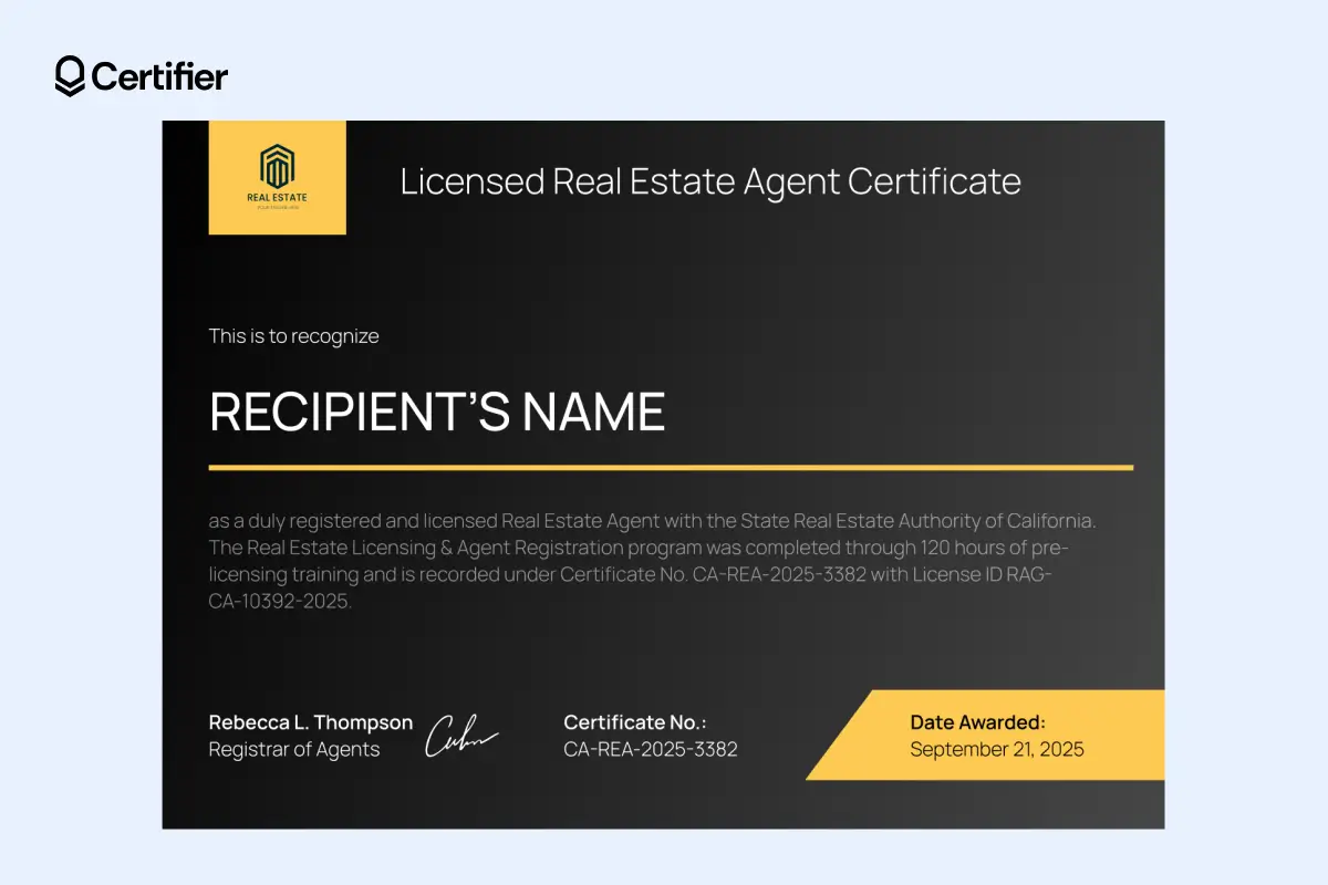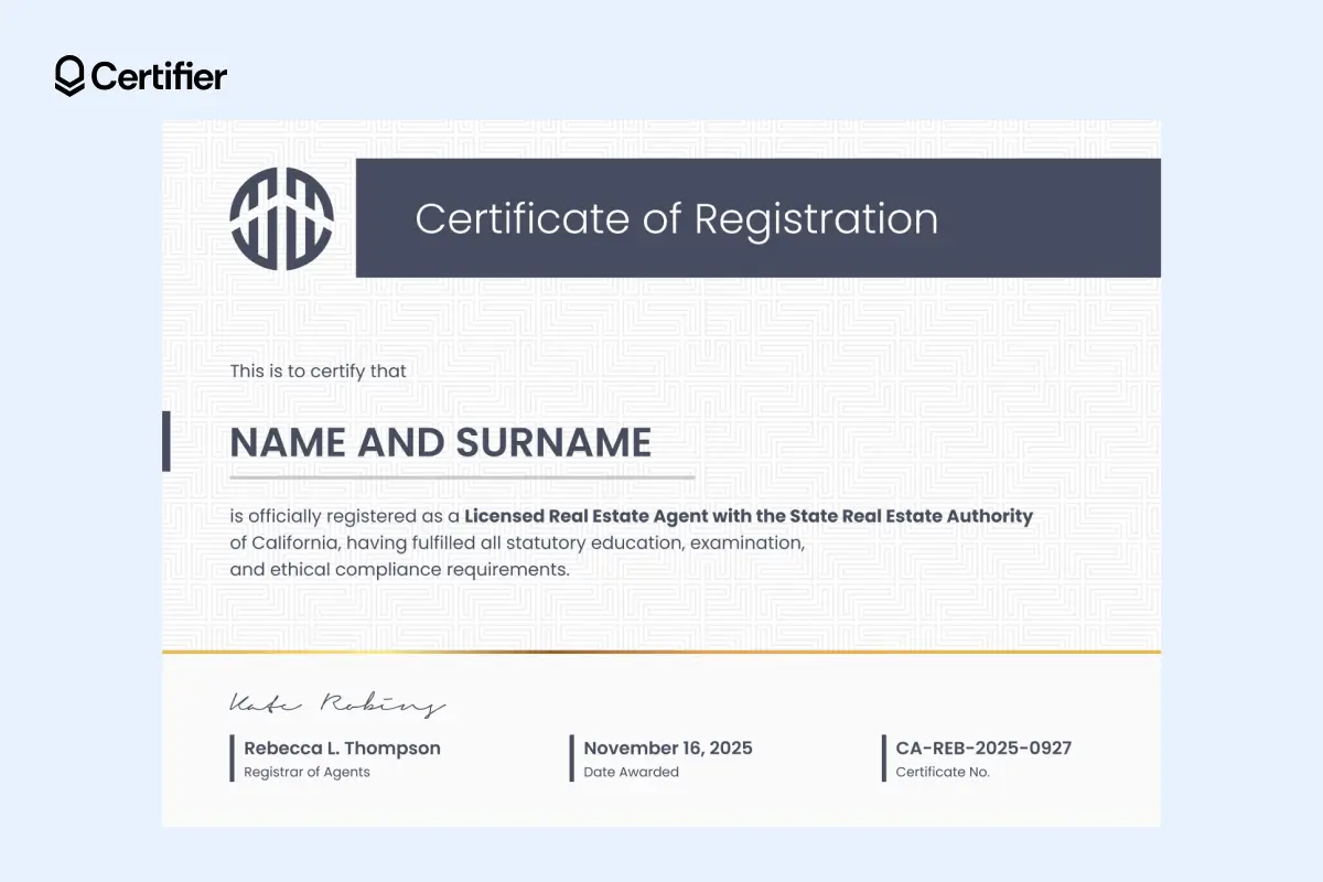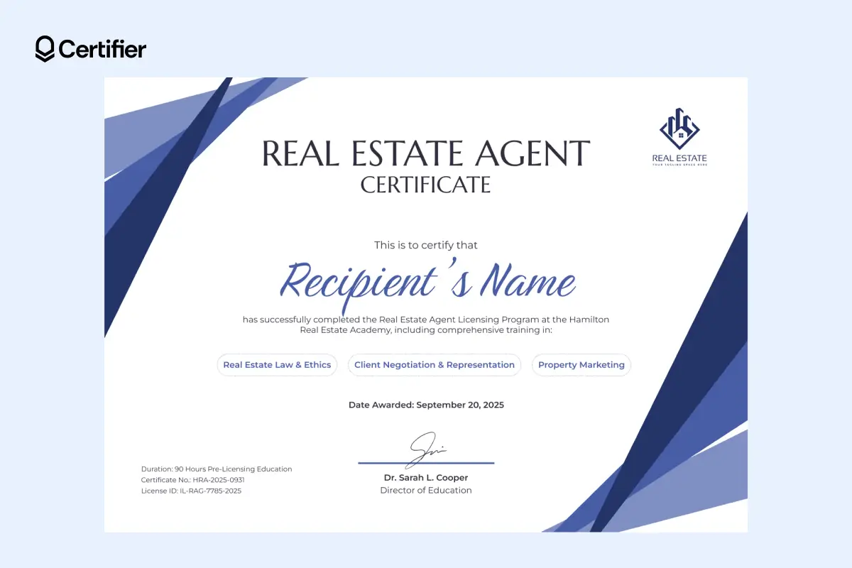 Here, you’ll find a collection of ready-to-edit templates for every purpose, from real estate licensing and training completions to ownership registration and achievement awards.