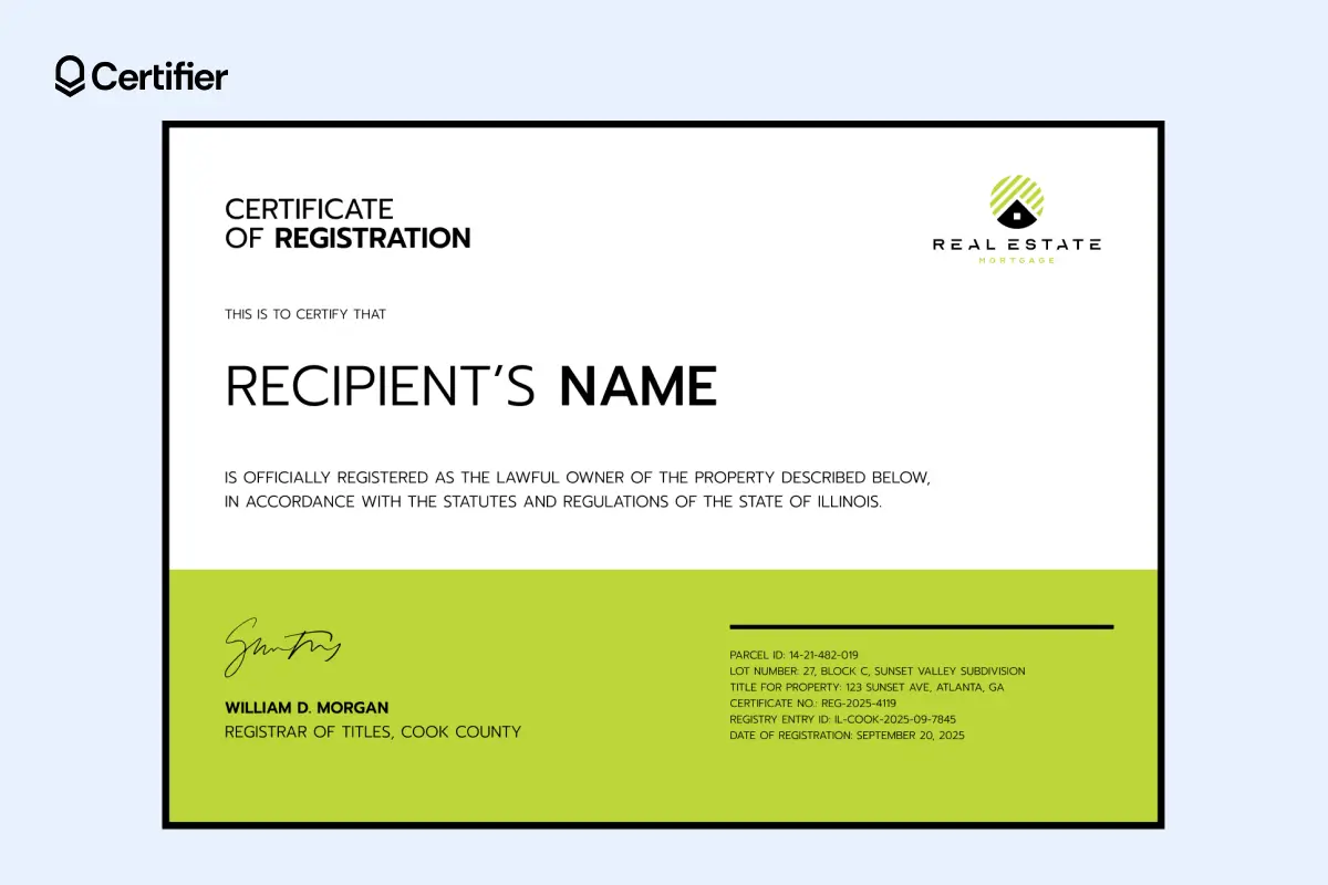 A bright green accent adds energy to this real estate certificate template, ideal for property registration, title confirmation or mortgage documentation.