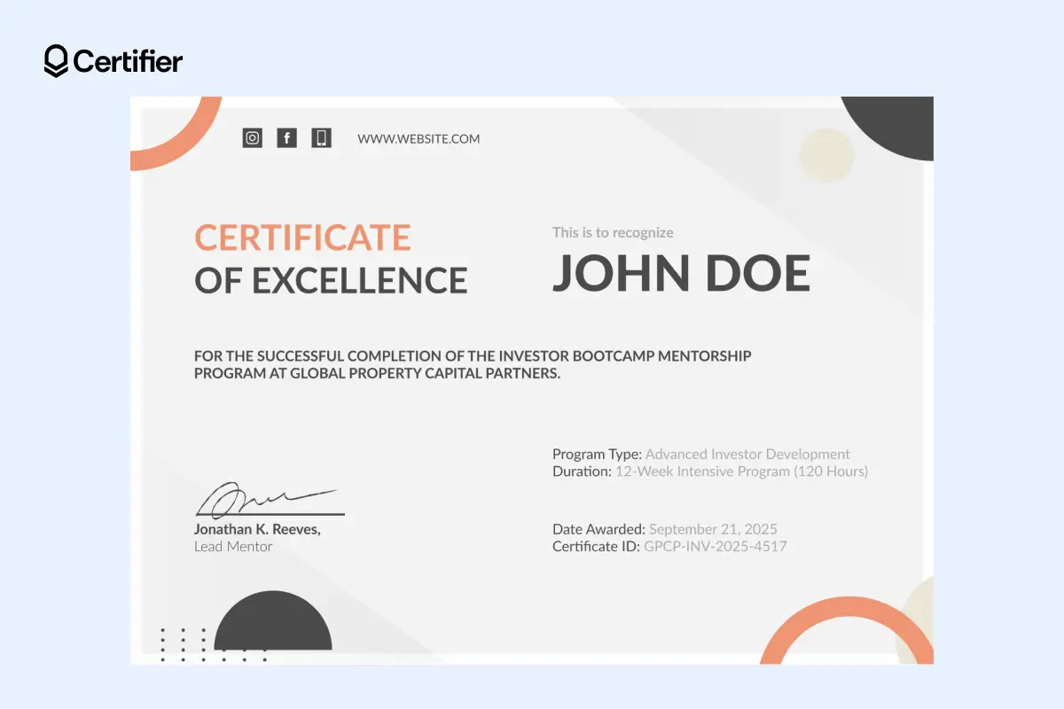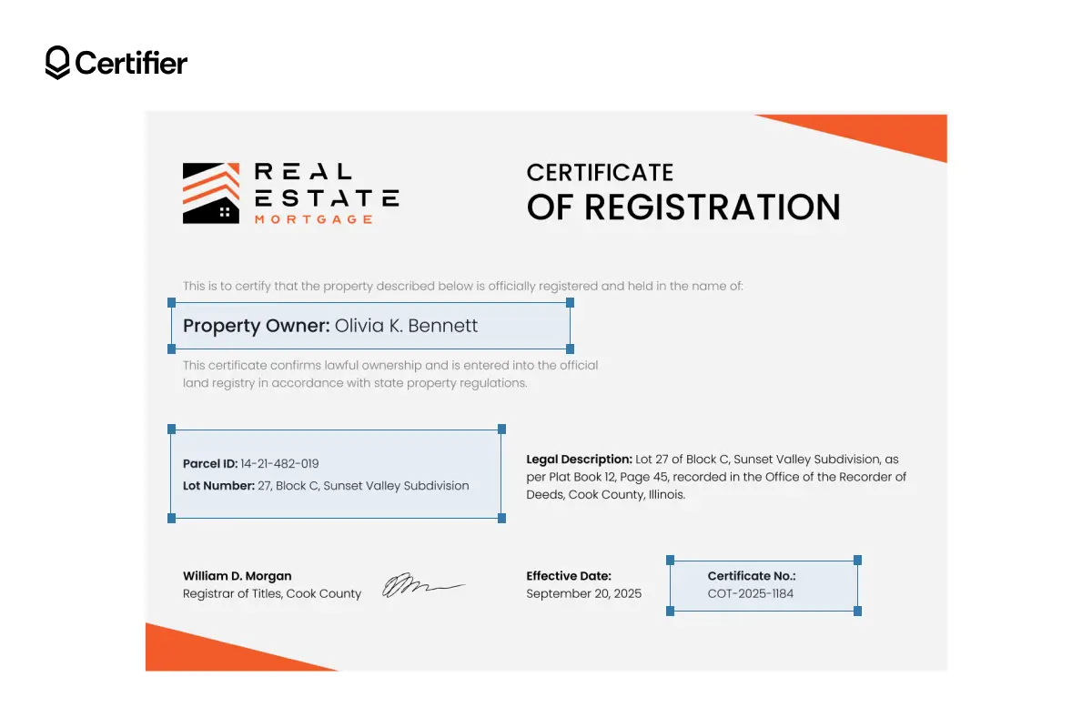Creating certificates from scratch takes time, from designing layouts to entering recipient data manually. These real estate certificate templates eliminate that hassle by giving you professionally designed, ready-to-use layouts that can be issued and edited at scale.