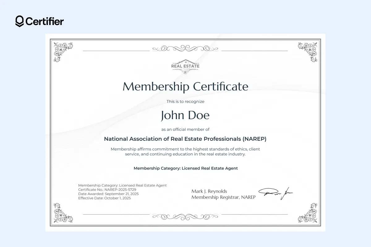 A well-balanced mix of simplicity and formality makes this real estate membership certificate template perfect for professional organizations.