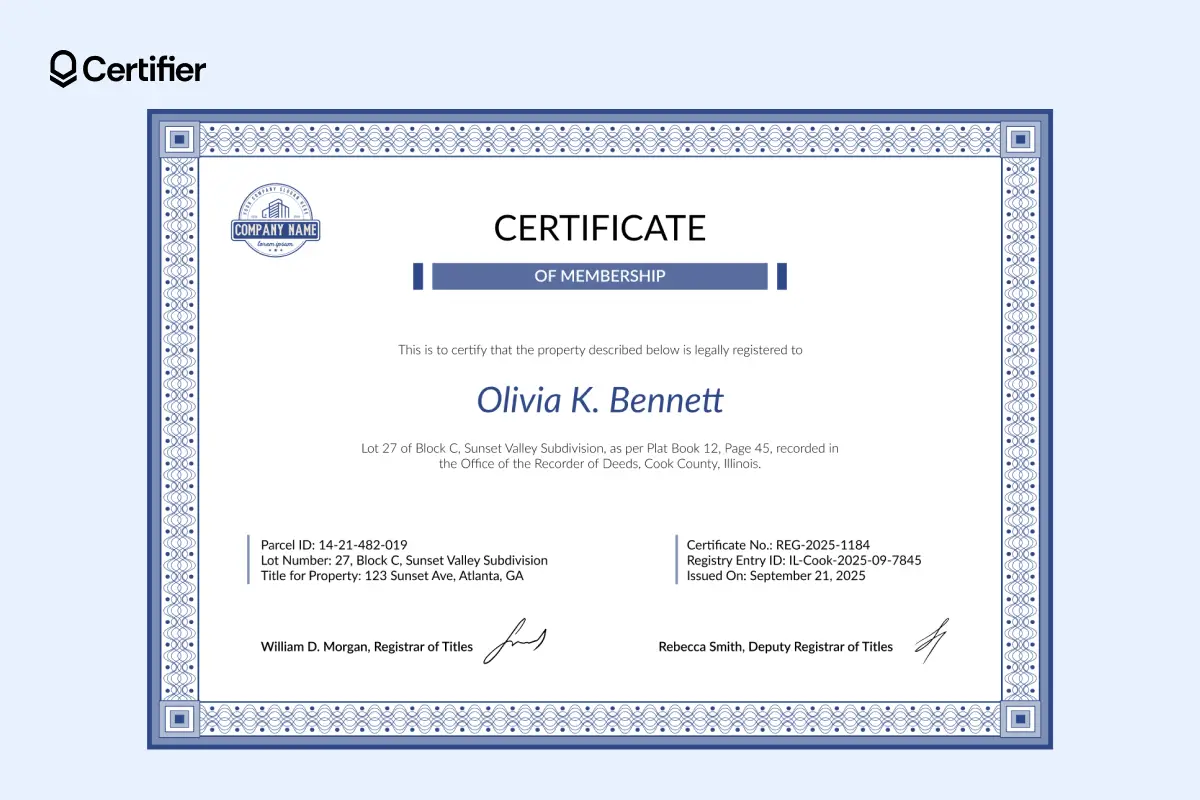 This real estate compliance certificate template suits registrars, title offices and notaries that handle land ownership or membership documentation.
