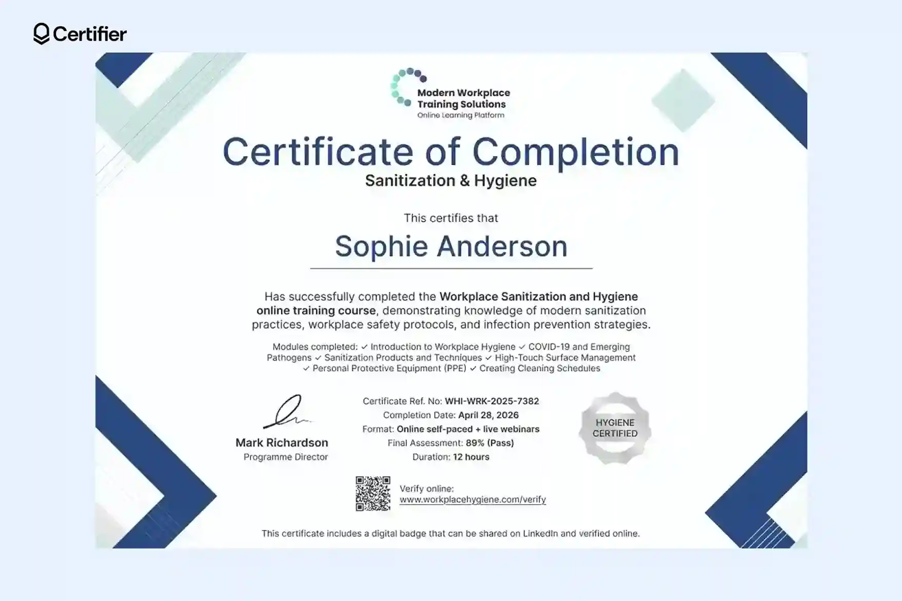 There’s also a modern certificate of sanitization template designed for workplace sanitization and hygiene training. It lists participant name, course focus, completed modules, training format, assessment result and duration. Clean typography and geometric elements reflect a contemporary learning environment.