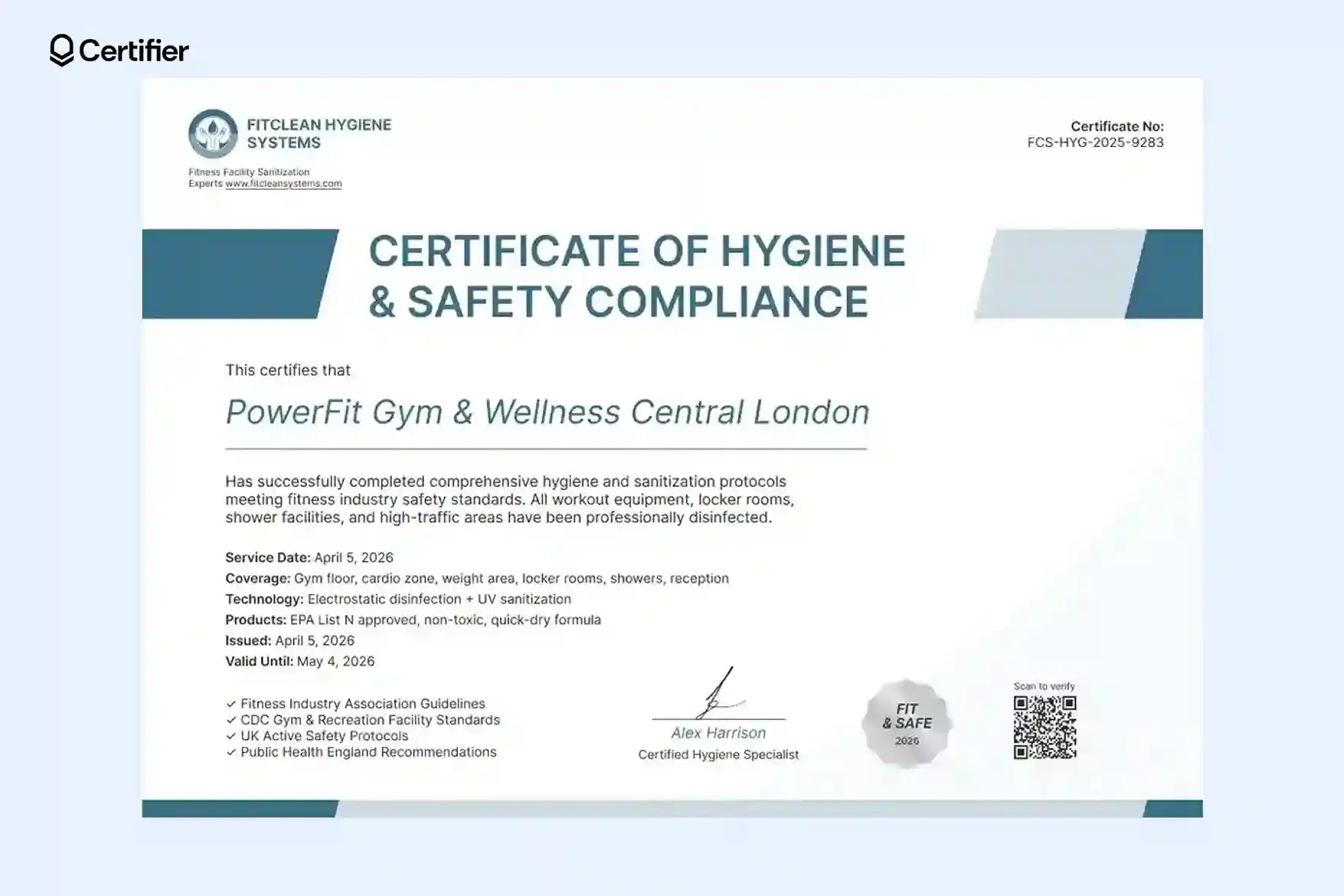 The next sanitization certification template is designed for gyms and wellness centers. Covered areas such as workout zones, locker rooms and showers are clearly listed alongside service dates and products used. Visual elements reference fitness standards and public health guidance.