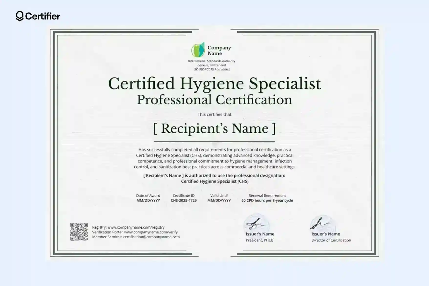 Now take a look at this formal professional certification template, which is prepared for individual hygiene specialists. The design includes recipient name, certification title, authorization statement, award date, renewal requirements and official signatures.