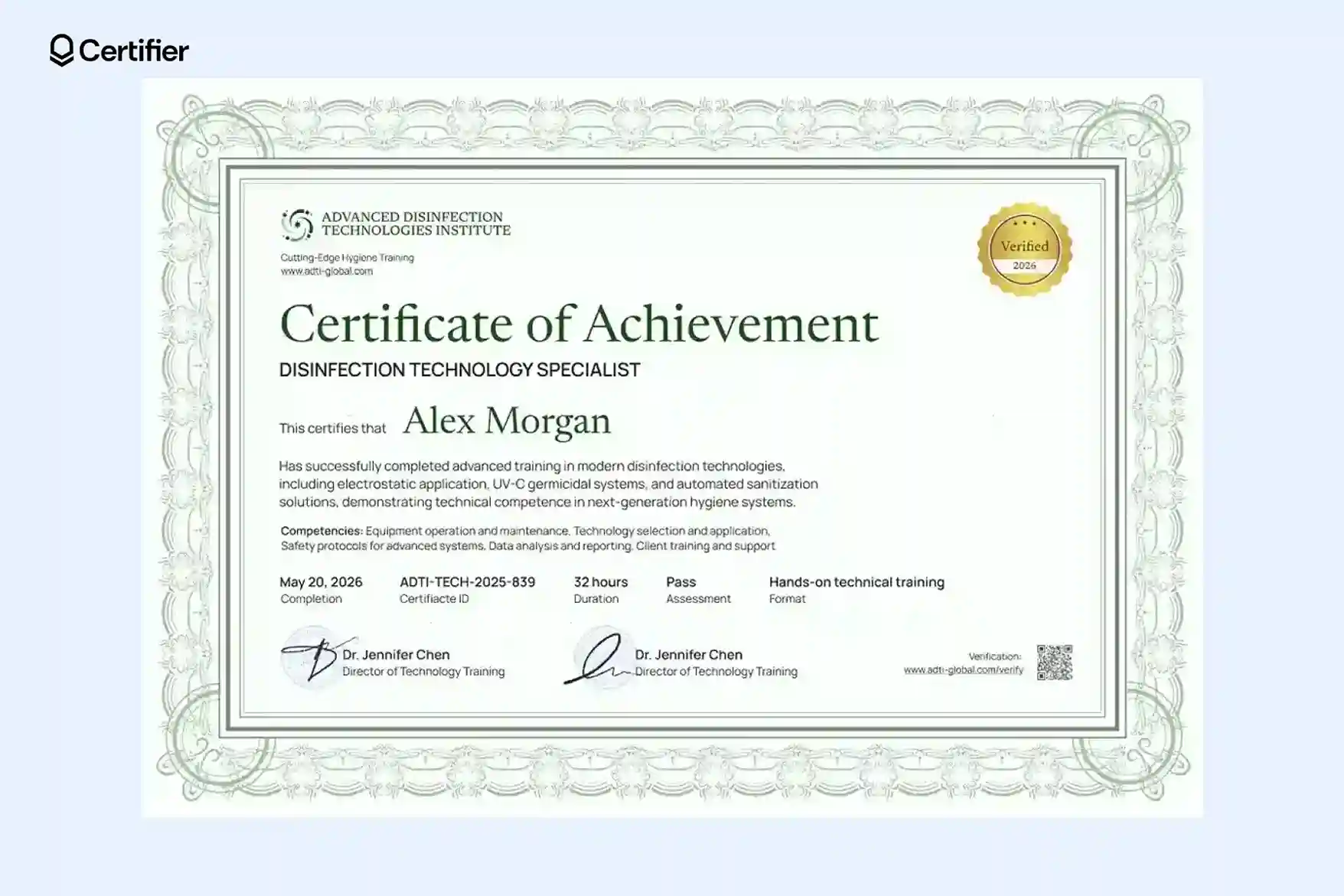 Our next sanitization certification template is a classic certificate of achievement created for advanced disinfection technology training.