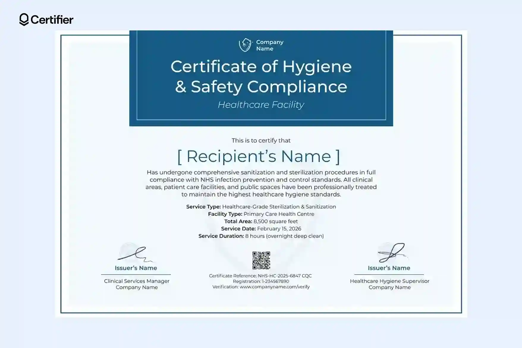 A single certificate of sanitization template can serve multiple clients, saving time when similar certificates are issued regularly. Use Certifier and fine-tune this layout beyond hospitality.