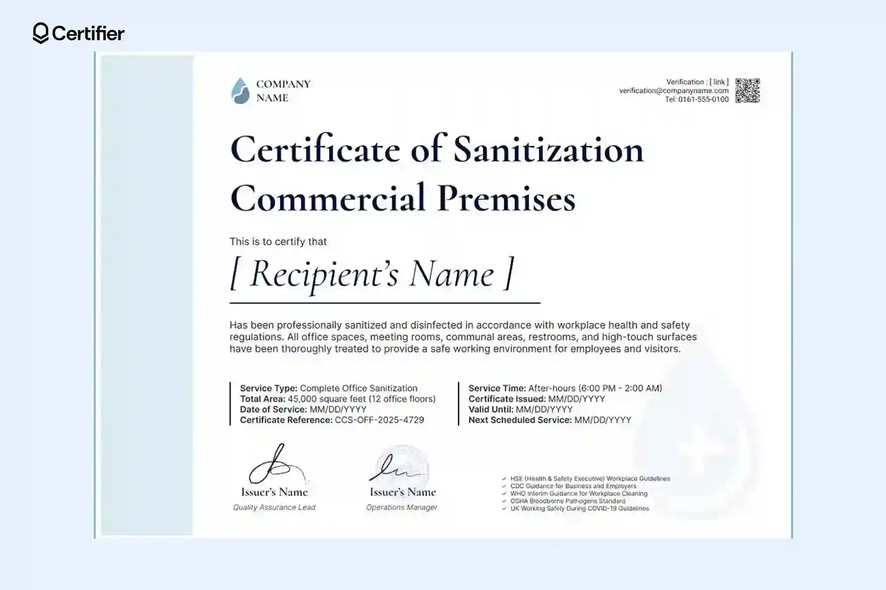 Each certificate of sanitization template is designed for real business use and can be edited in Certifier or downloaded as a ready document depending on how you work.