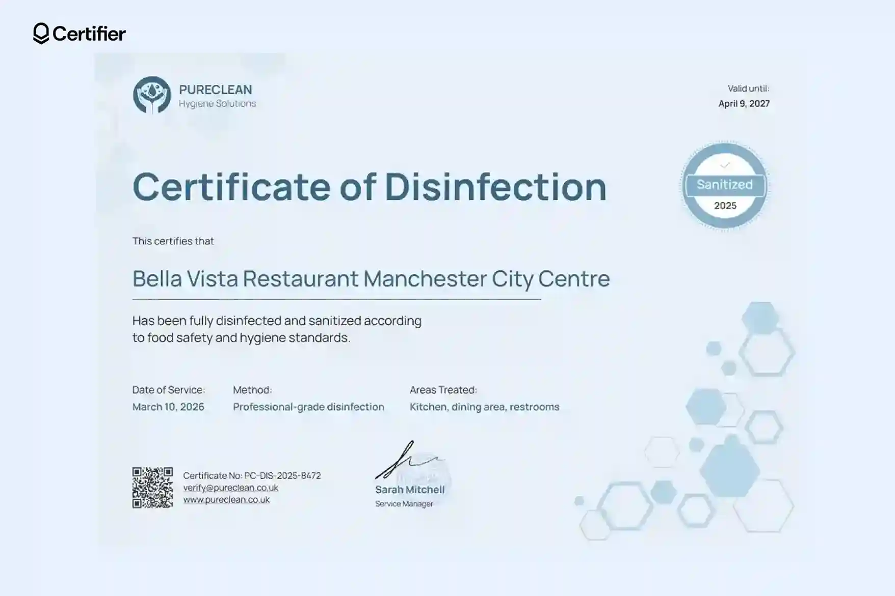 A clean and approachable certificate of disinfection designed for food service environments. The template highlights the restaurant name, service date, treated areas like kitchens and restrooms and the disinfection method used. A visible validity badge supports trust with guests and local inspectors.
