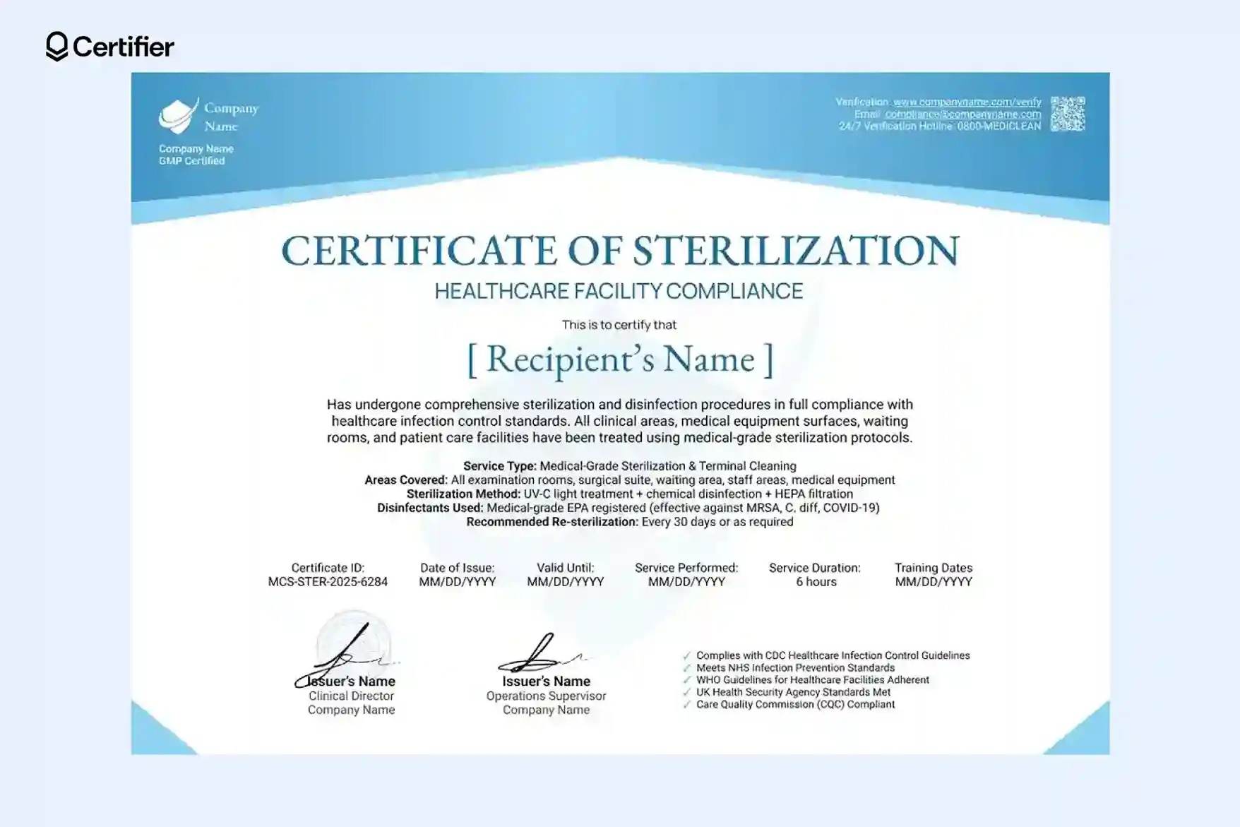 Need a certificate of sanitization template? Check our collection of 15 ready-made designs. Edit them in Certifier or download—all for free.