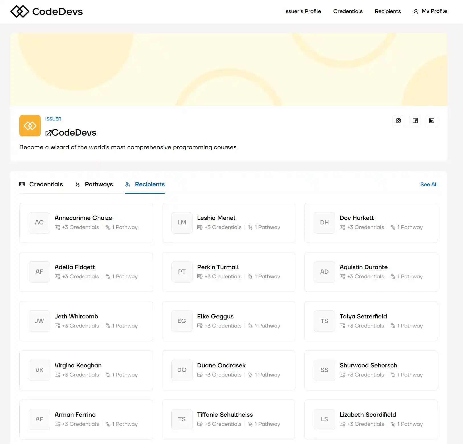 Issuers add learner data, choose the right credential and Certifier delivers it digitally to each recipient. All issued credentials are stored in one system, which makes it easier to connect them into stackable learning paths and manage learner progress over time.