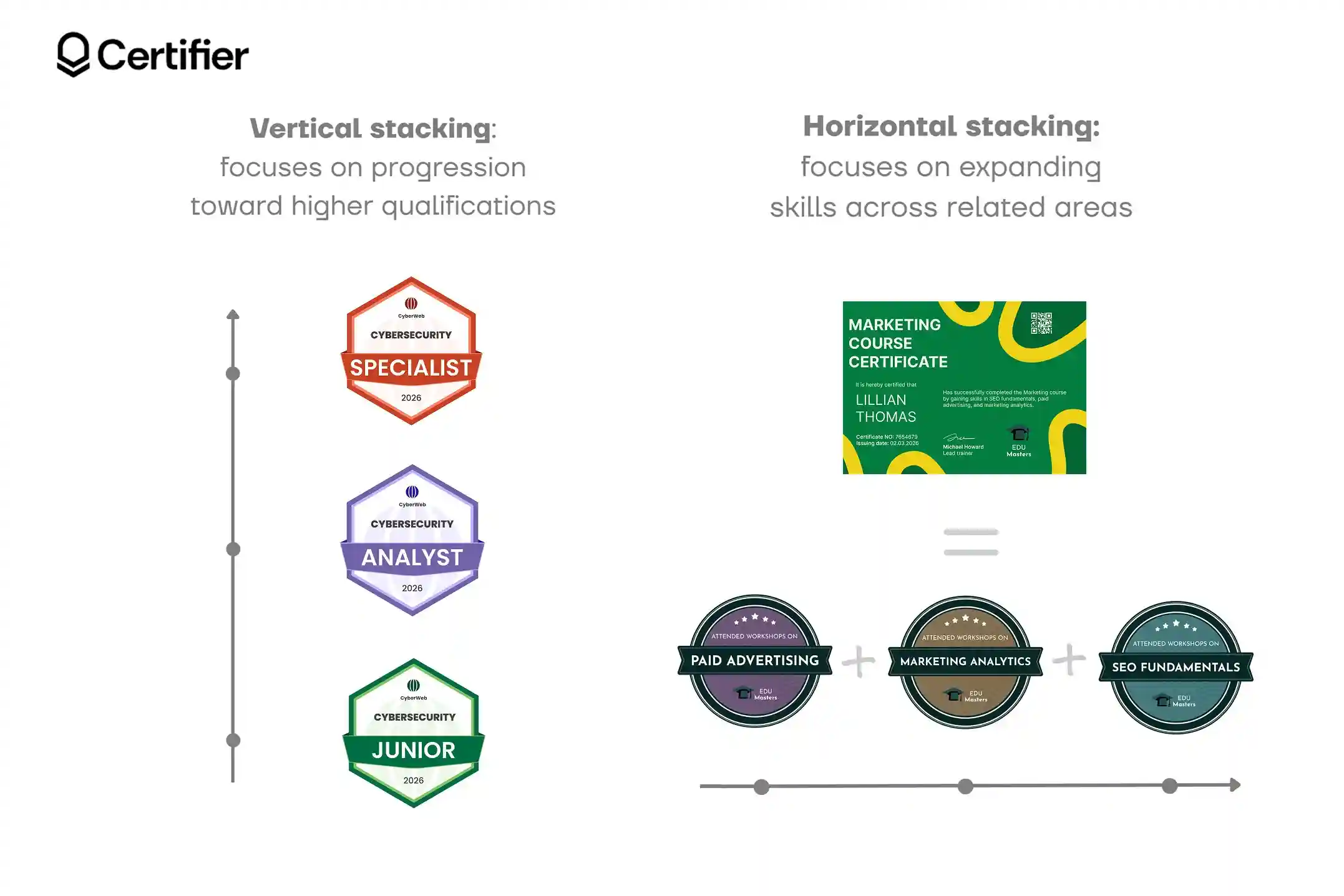 Vertical stacking focuses on progression. Learners move from foundational credentials toward more advanced qualifications over time.