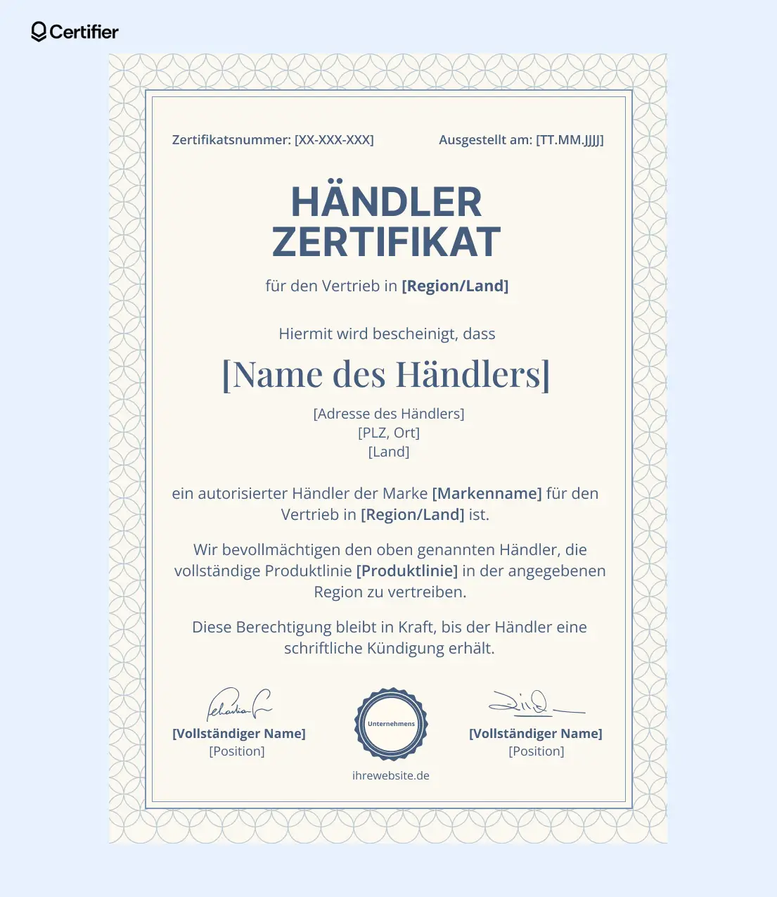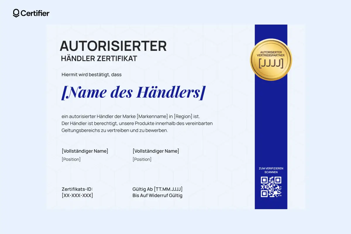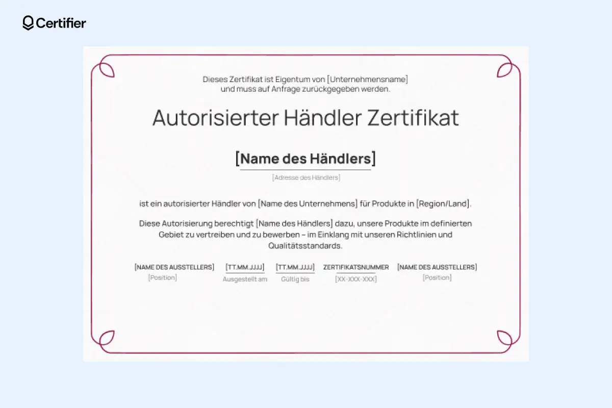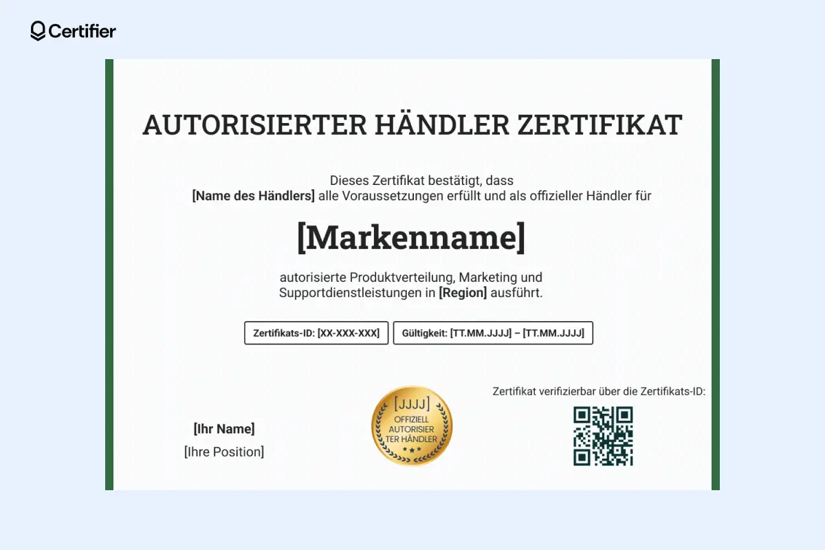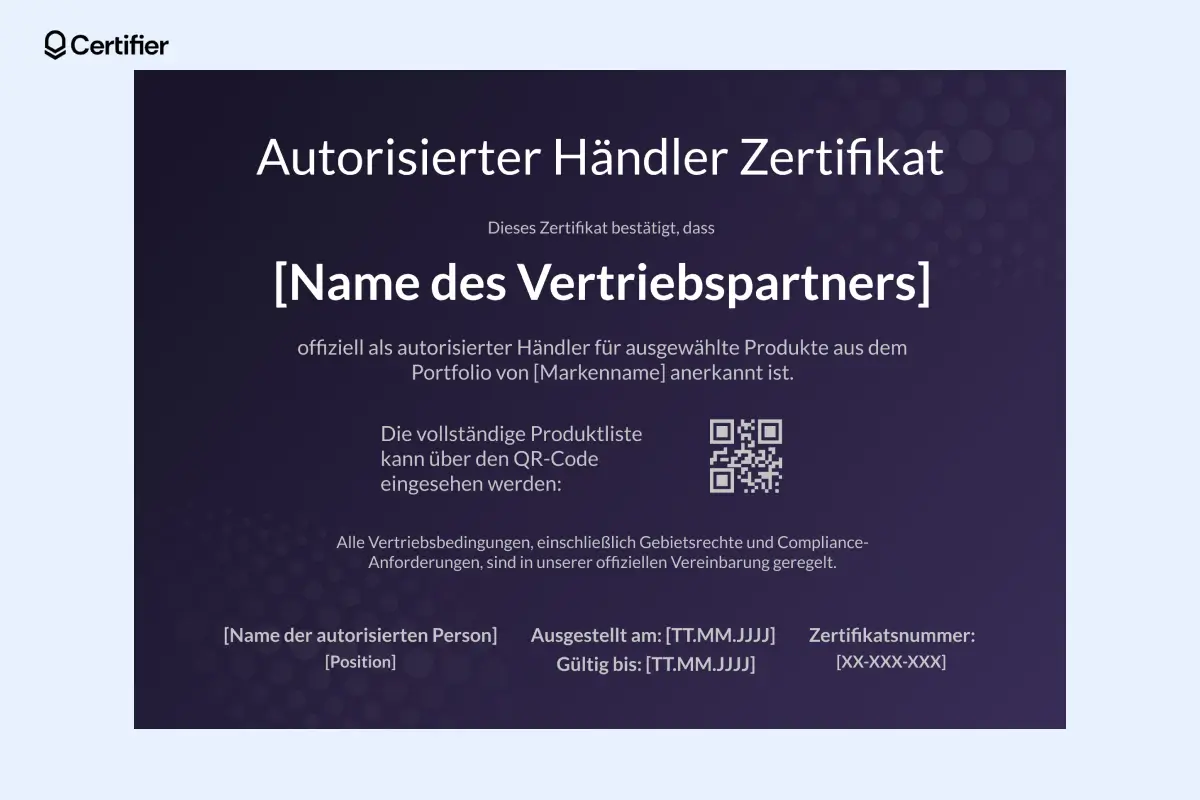Wenn Sie dieses Zertifikat lieber in Word bearbeiten möchten, können Sie es direkt im Certifier-Vorlagenmarkt als Muster herunterladen und individuell an Ihre Anforderungen für autorisierte Vertriebspartner anpassen.