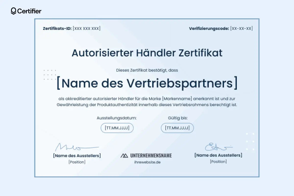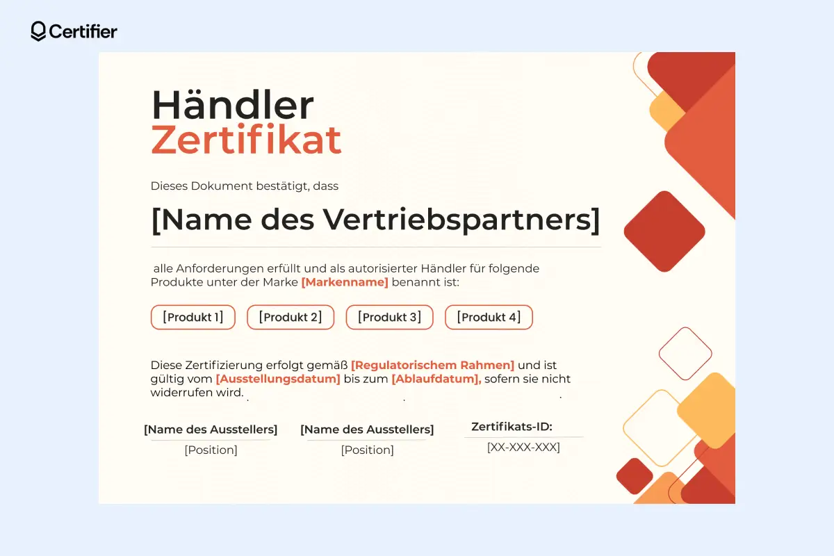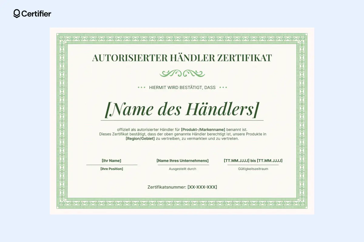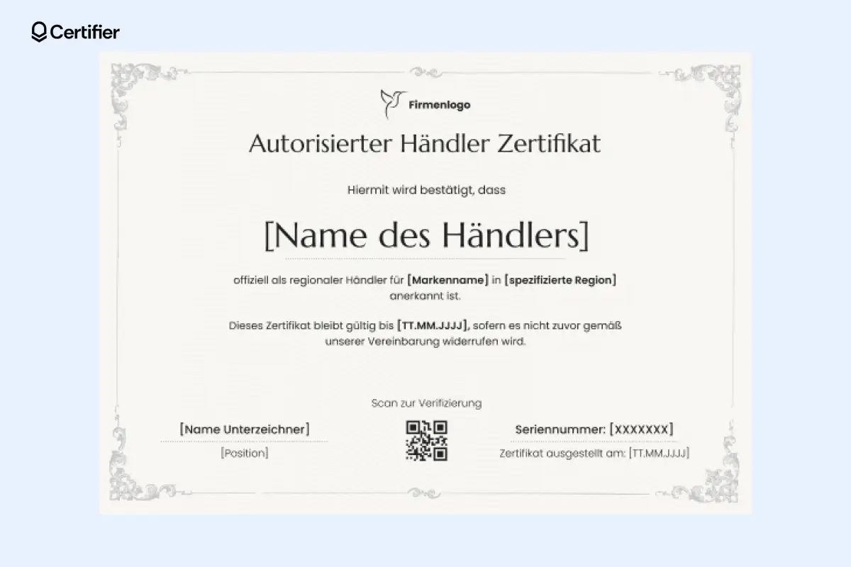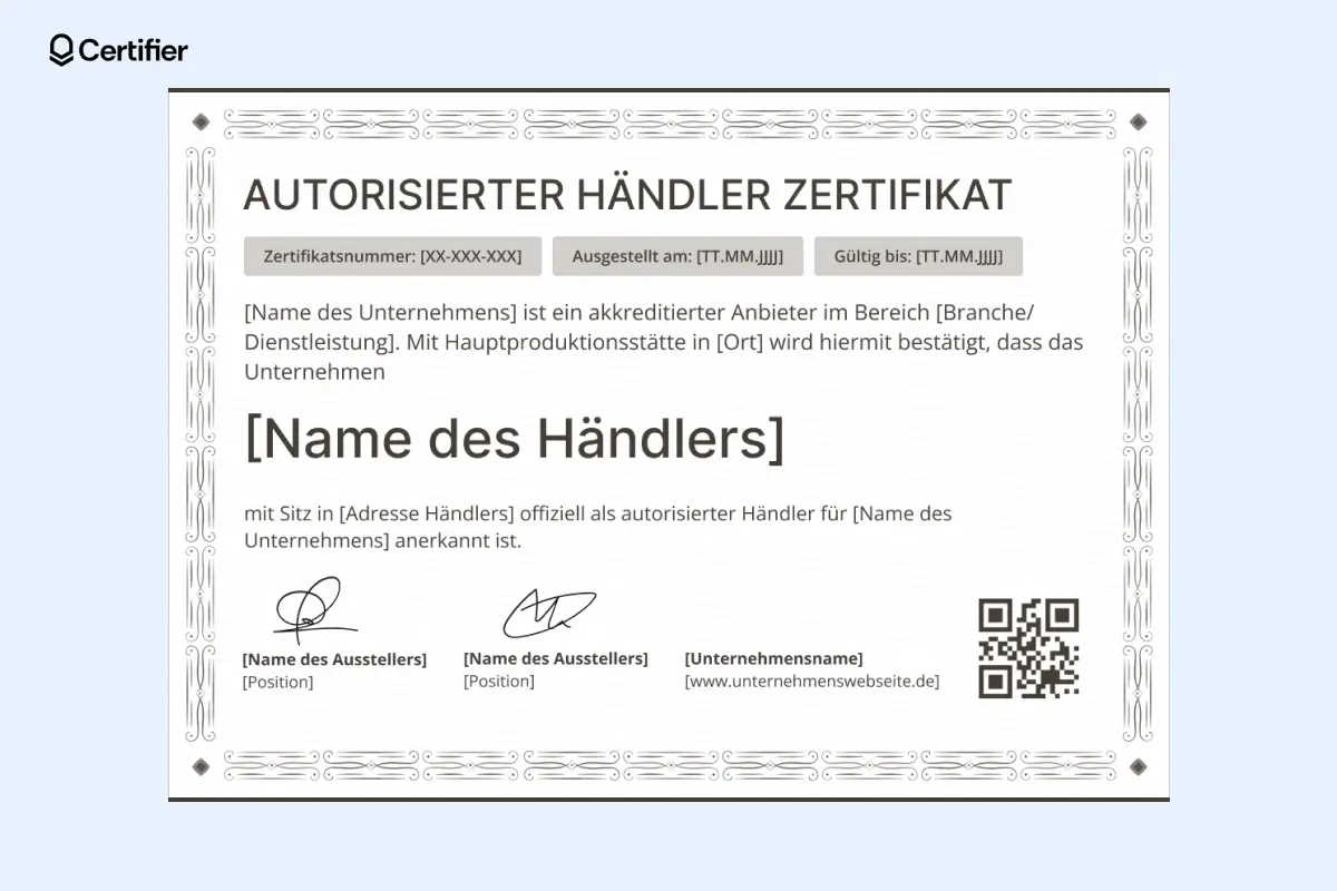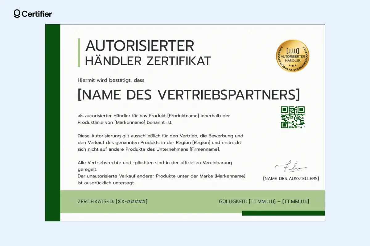 Ein überzeugendes Beispiel für ein Händlerzertifikat sollte folgende Elemente enthalten: